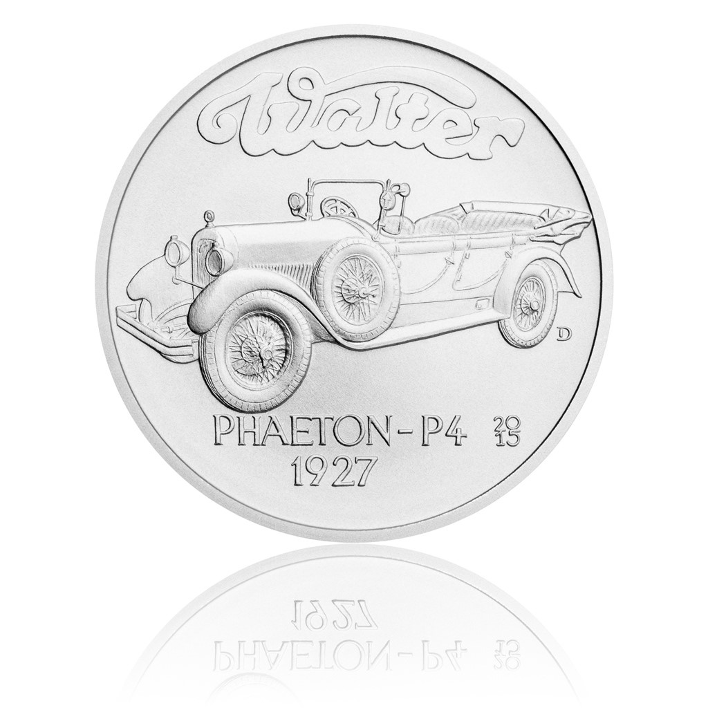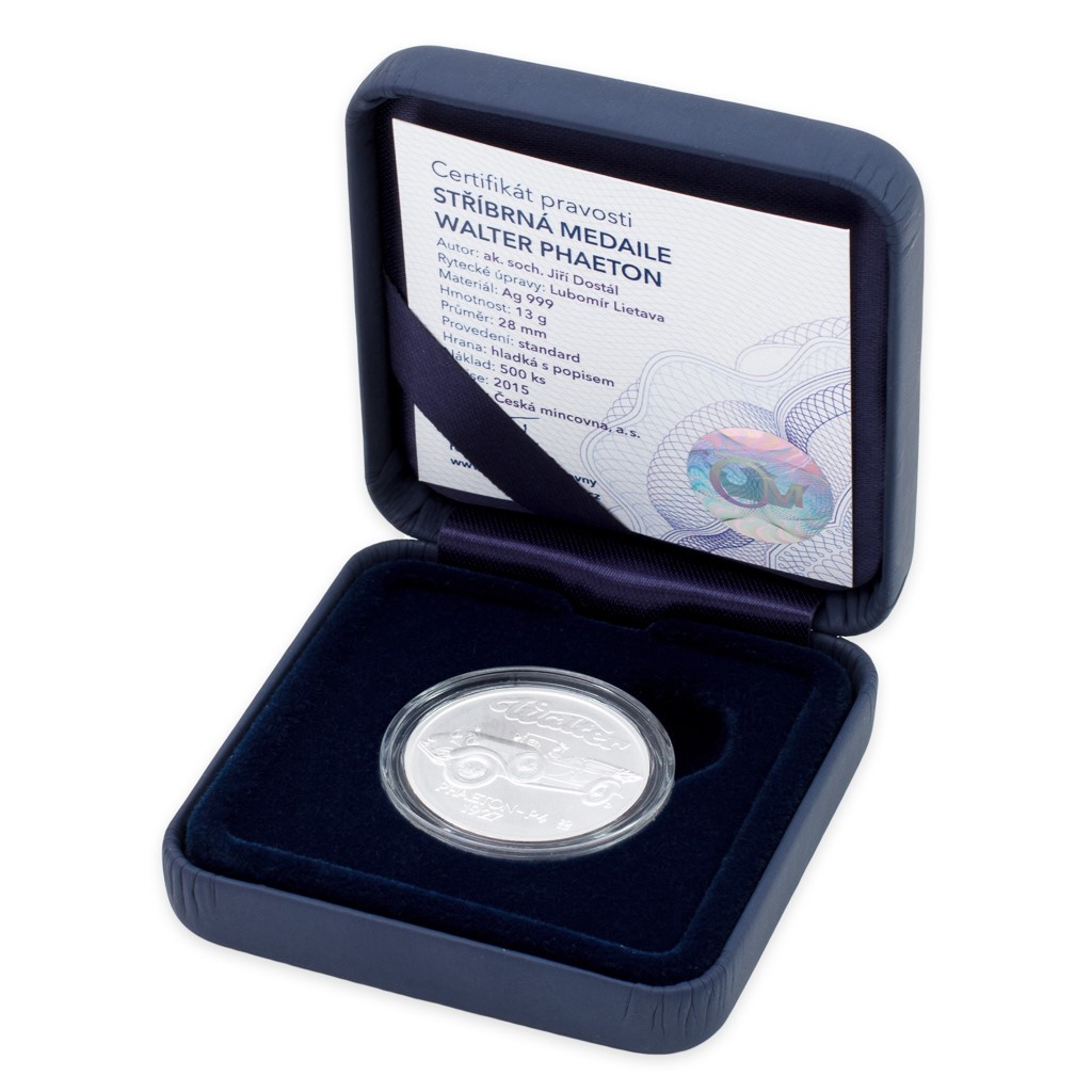 Další legendu českého motorismu, vůz Walter Phaeton, převedl do podoby atraktivní ražby z ryzího stříbra akademický sochař Jiří Dostál. Averz stříbrné medaile věnoval ladným křivkám vozu spolu s logem firmy Walter, typem vozu PHAETON P-4 a letopočtem 1927. Reverz s působivým zpracováním automobilového kola nese na obvodu název série HISTORIE MOTORISMU V ČESKÝCH ZEMÍCH. Medaile je uložena v modré kožené etuji a stane se krásným dárkem pro Vaše blízké či přátele, kteří jsou obdivovateli majestátních veteránů. Rozhodně se však bude vyjímat také ve vašich sbírkách – udělejte si radost a pořiďte si jeden z 500 kousků coby ozdobu své numismatické kolekce!