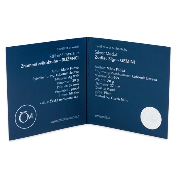 Stříbrná medaile České mincovny ze série 12 znamení zvěrokruhu představuje originální dárek pro každého, kdo se narodil ve znamení Blíženců.