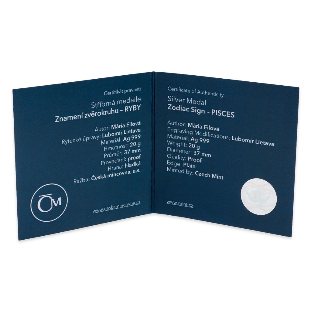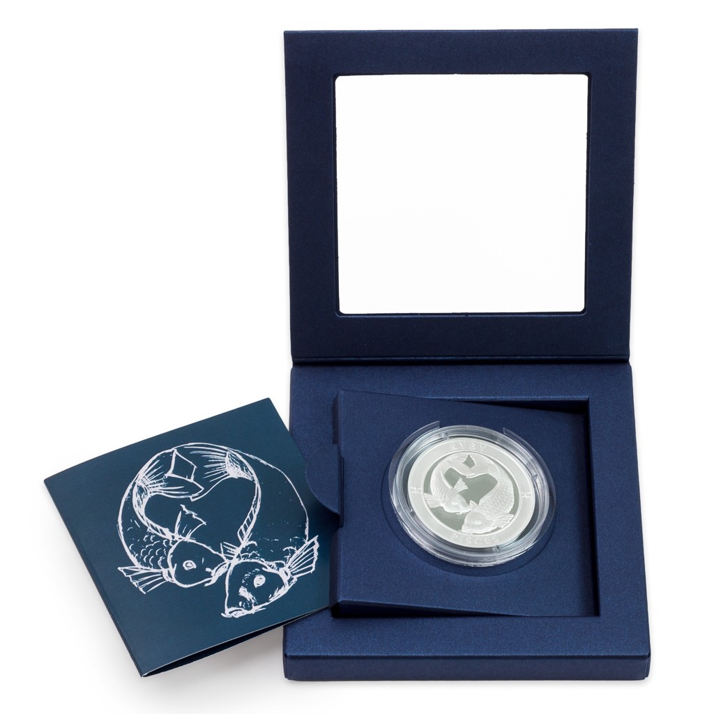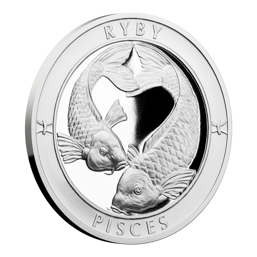 Stříbrná medaile ze série 12 znamení zvěrokruhu České mincovny se stane talismanem pro štěstí každému, kdo se narodil ve znamení Ryb.
