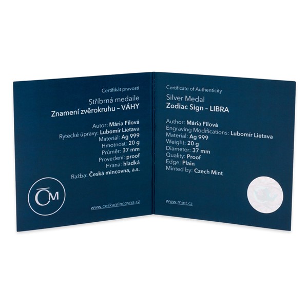 Stříbrná medaile s motivem znamení Vah je součástí cyklu České mincovny 12 znamení zvěrokruhu. Citovou hodnotu ryzího dárku ještě navýší věnování, které vyryjeme přímo na medaili.