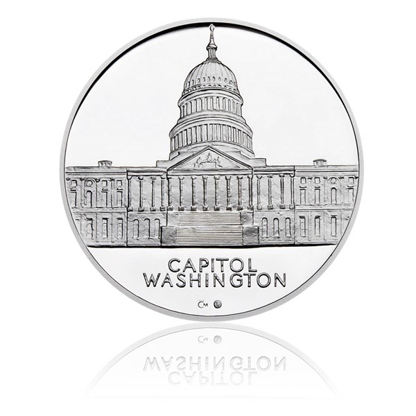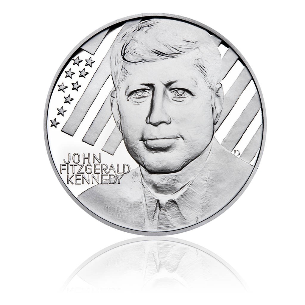 Medaile věnovaná Johnu Fitzgeraldu Kennedymu vznikla jako pocta 35. prezidentovi USA (1917–1963), jehož život násilně ukončila kulka atentátníka v roce 1963 v Dallasu. Medaile byla vydána k 50. výročí zvolení Kennedyho prezidentem. Jméno nesmírně populárního prezidenta je spojováno mj. s větou, kterou pronesl ve svém inauguračním projevu v lednu 1961: Neptej se, co může udělat tvá zem pro tebe. Ptej se, co můžeš ty udělat pro svou zem. Averzní strana medaile nese portrét Johna Fitzgeralda Kennedyho, v pozadí s americkou vlajkou. Reverzní strana znázorňuje Kapitol – sídlo amerického Kongresu v hlavním městě USA, Washingtonu. Limitovaná emise 1000 kusů.