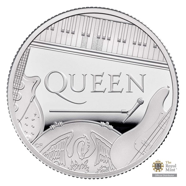 Výtvarník Chris Facey umístil na reverzní stranu mince logo skupiny obklopené hudebními nástroji – kytarou Red Special Briana Maye, bicími Ludwig Rogera Taylora, basovou kytarou Fender Precision Johna Deacona a klavírem Bechstein Freddieho Mercuryho spolu s mikrofonem na tyči. Hudební znalci si jistě všimnou, že tři stisknuté klávesy na klaviatuře odpovídají počátečním tónům skladby Bohemian Rhapsody. Averzní strana mince náleží atributům emitenta – tj. nominální hodnotě 1 POUND (GBP), portrétu královny Alžběty II. a textu „ELIZABETH II D G REG F D“ (Alžběta II., z Boží milosti královna, ochránkyně víry).