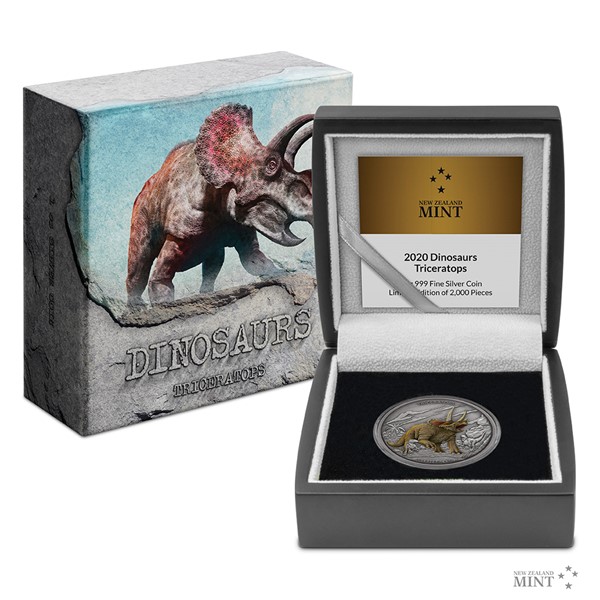 Stříbrná mince 1 OZ 2 NZD Dinosaurus: Triceratops stand