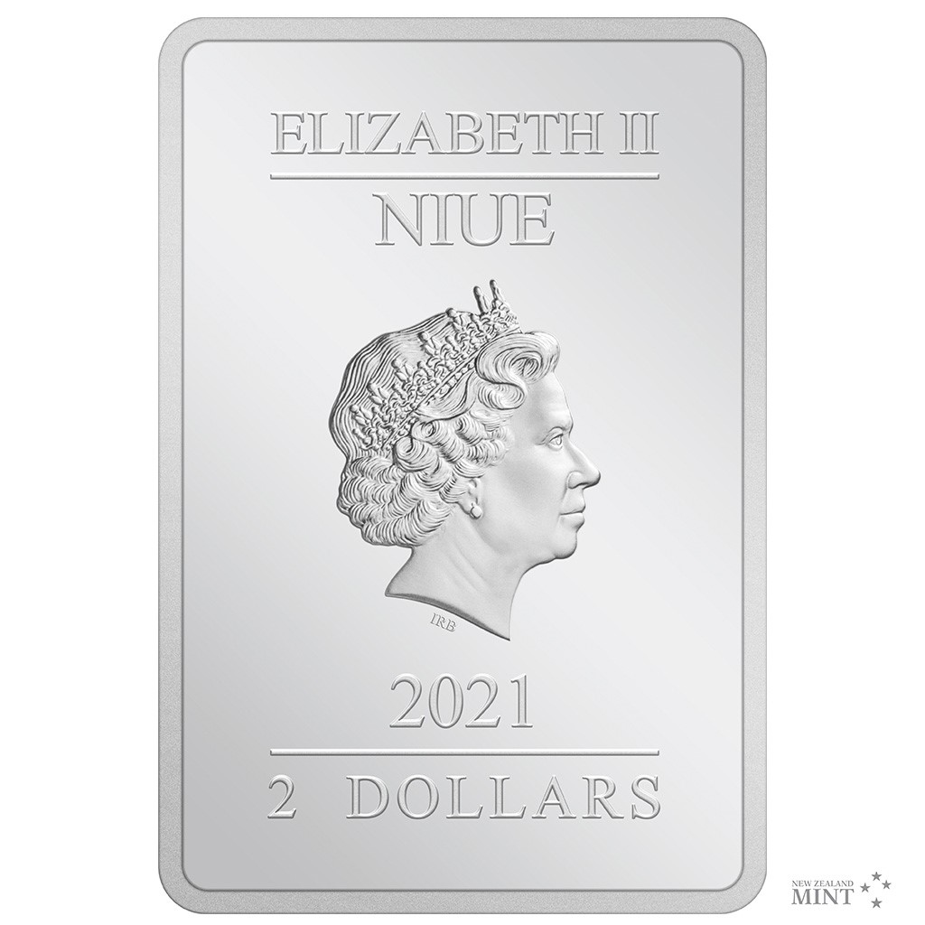 Neobvyklá obdélníková mince má podobu filmového plakátu. V živých barvách, kterých bylo docíleno technologií kolorování, se objevuje trojice nerozlučných přátel – Harry, Ron a Hermiona –, které doprovází sám Albus Brumbál. Ve stříbrném reliéfu se pak vyjímá centrum Londýna. Protože vydavatelem mince je ostrov Niue, její averzní strana nese jeho atributy – portrét a jméno královny Alžběty II., rok vydání mince 2021 a nominální hodnotu 2 DOLLARS (NZD). Podoba oficiálně licencované ražby je dílem výtvarného kolektivu Novozélandské mincovny.