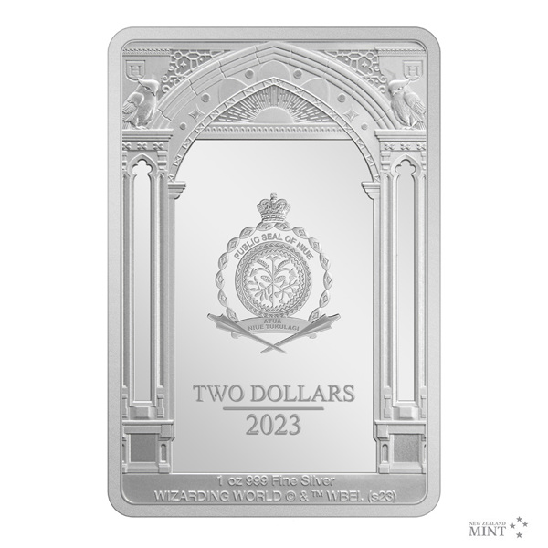 Reverzní strana netradiční obdélníkové mince předkládá letícího fénixe Fawkese. Reliéfně zpracovaný opeřenec je obklopen kolorovanými plameny. Dekorativní portál, který lemuje obvod mince, je dozdoben oranžovými šatonky. Averz je pak věnován nezbytným atributům emitenta, kterým je ostrov Niue – tedy státnímu znaku, nominální hodnotě TWO DOLLARS (NZD) a roku emise 2023. Minci v oficiální filmové licenci vyrazil tým Novozélandské mincovny.
