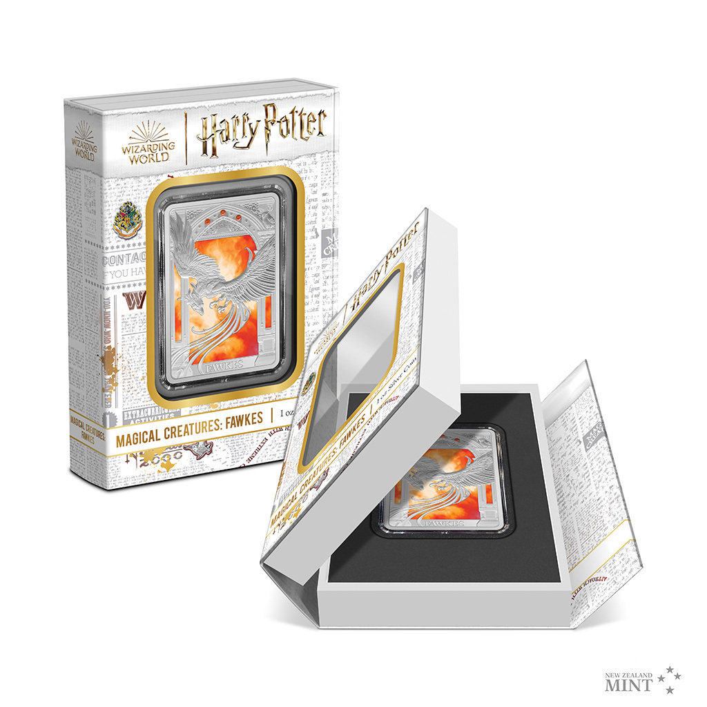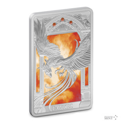 Na první stříbrné minci z nového cyklu, který představuje kouzelné tvory ze světa Harryho Pottera, najdete fénixe Fawkese.