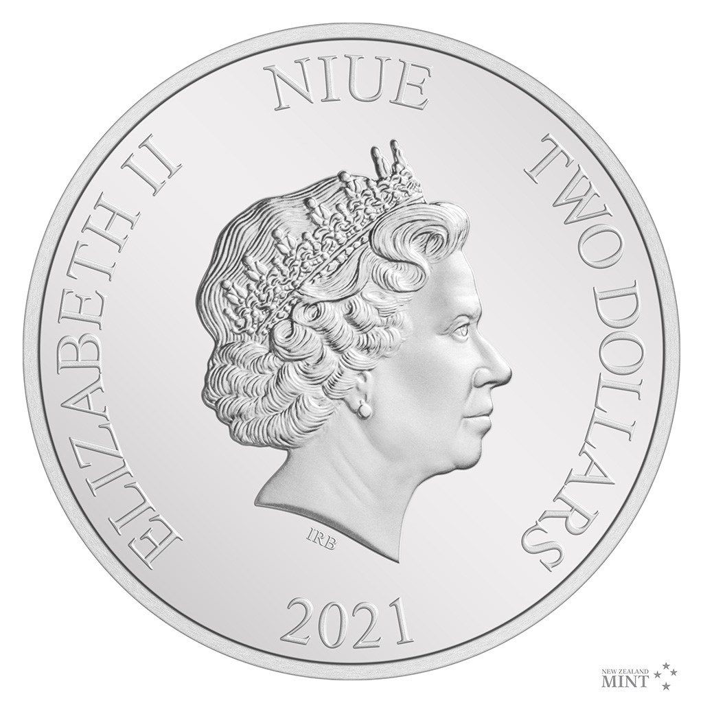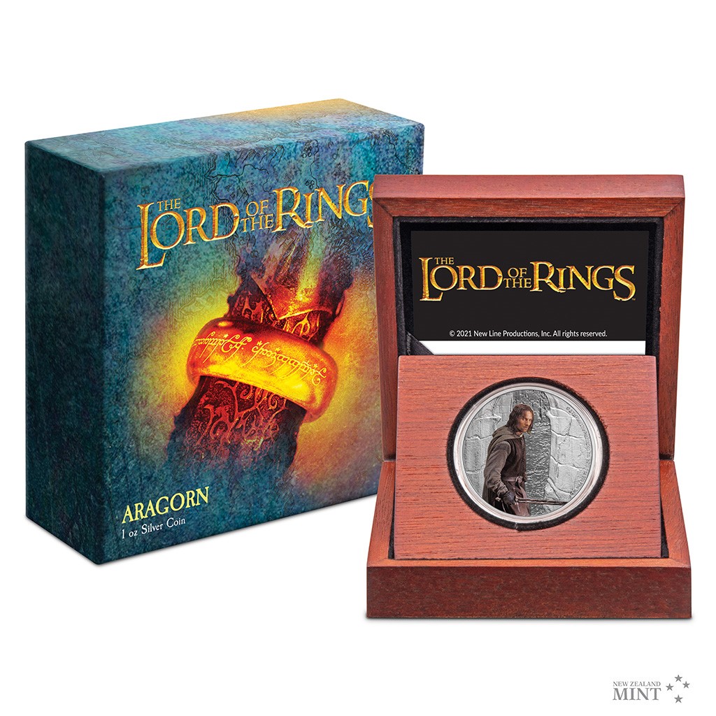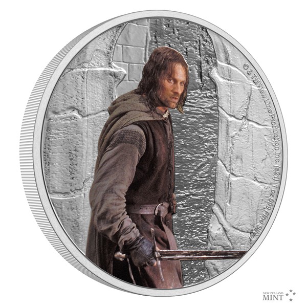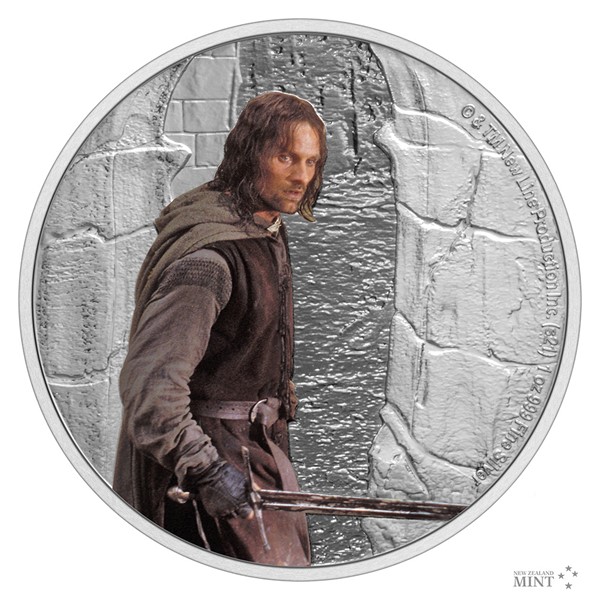 Reverzní straně mince dominuje kolorované vyobrazení Aragorna, který se chystá na boj s černými jezdci. V okolním reliéfu najdete ruiny pevnosti na vrcholu Větrova. Averzní strana pak předkládá portrét a jméno panovnice Alžběty II., rok vydání 2021 a nominální hodnotu TWO DOLLARS (NZD) – tedy atributy emitenta mince, kterým je ostrov Niue. Minci v oficiální filmové licenci vyrazil tým Novozélandské mincovny.