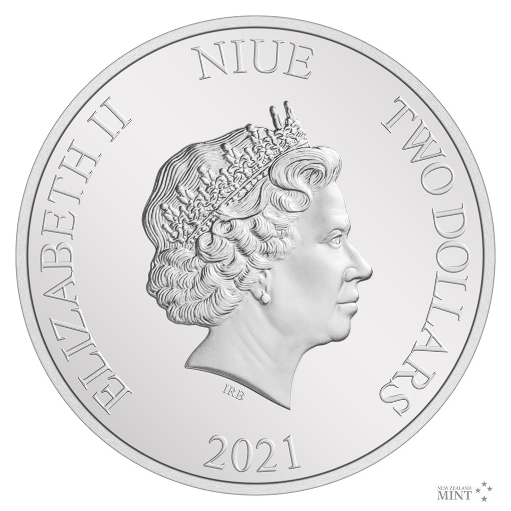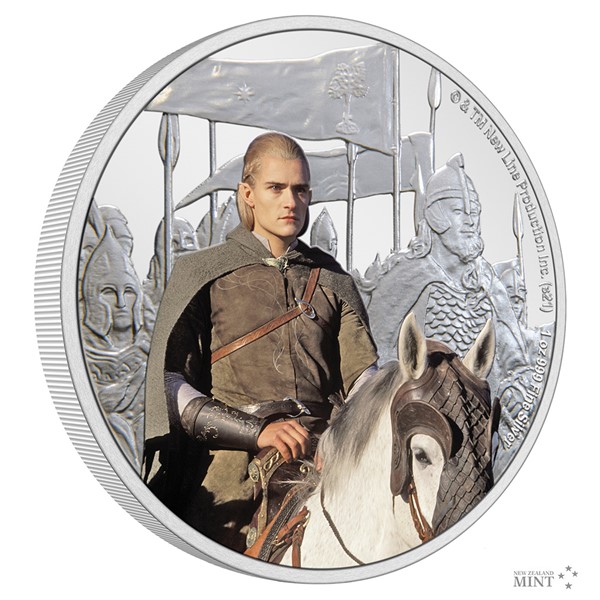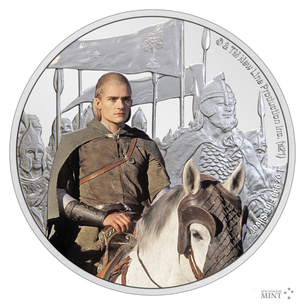Reverzní straně mince dominuje kolorované vyobrazení Legolase, který sedí na svém věrném hřebci Arodovi. V okolním reliéfu najdete jezdce Rohanu a Gondoru, kteří se chystají do bitvy. Averzní strana pak předkládá portrét a jméno panovnice Alžběty II., rok vydání 2021 a nominální hodnotu TWO DOLLARS (NZD) – tedy atributy emitenta mince, kterým je ostrov Niue. Minci v oficiální filmové licenci vyrazil tým Novozélandské mincovny.