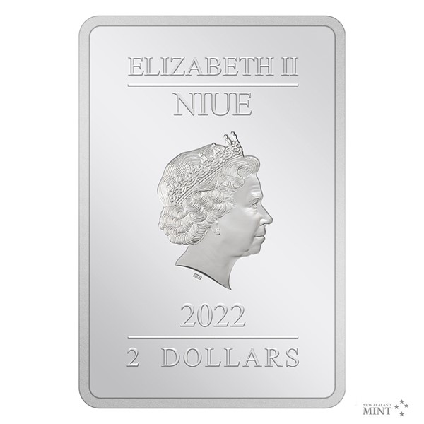 Neobvyklá obdélníková mince má podobu filmového plakátu. V živých barvách, kterých bylo docíleno technologií kolorování, se vyjímají oblíbené postavy příběhu – Frodo, Gandalf, Aragorn, Arwen, Legolas, Gimli, Sam, Éowyn, Glum a Saruman. Stříbrnému reliéfu pak vévodí Sauronova pevnost Barad-dûr – čili jedna z titulárních dvou věží. Protože vydavatelem mince je ostrov Niue, její averzní strana nese jeho atributy – portrét a jméno královny Alžběty II., rok vydání mince 2022 a nominální hodnotu 2 DOLLARS (NZD). Podoba oficiálně licencované ražby je dílem výtvarného kolektivu Novozélandské mincovny.
