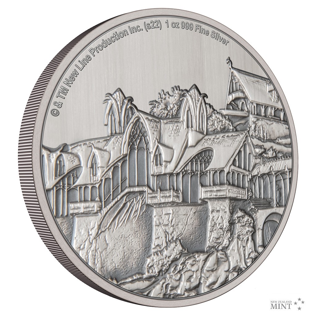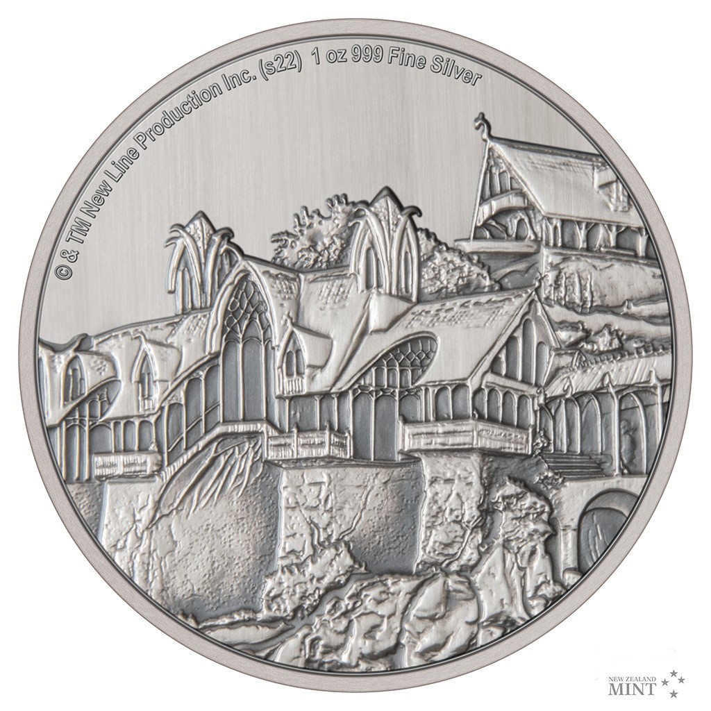 Reverzní straně mince vévodí elfské domy, které jsou zdobné, členité, vzdušné a plné světla. Reliéf je patinovaný, což dává vyniknout i těm nejmenším detailům. Averzní strana pak předkládá portrét a jméno panovnice Alžběty II., rok vydání 2022 a nominální hodnotu TWO DOLLARS (NZD) – tedy atributy emitenta mince, kterým je ostrov Niue. Minci v oficiální filmové licenci vyrazil tým Novozélandské mincovny.