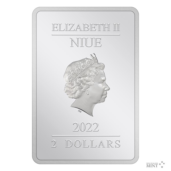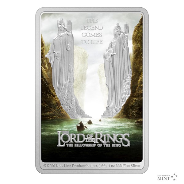 Neobvyklá obdélníková mince má podobu filmového plakátu. V živých barvách, kterých bylo docíleno technologií kolorování, se vyjímá údolí řeky Anduiny, po které se plaví členové Společenstva Prstenu. Stříbrnému reliéfu pak vévodí dvě majestátní sochy gondorských králů, které střeží soutěsku Argonath. Protože vydavatelem mince je ostrov Niue, její averzní strana nese jeho atributy – portrét a jméno královny Alžběty II., rok vydání mince 2022 a nominální hodnotu 2 DOLLARS (NZD). Podoba oficiálně licencované ražby je dílem výtvarného kolektivu Novozélandské mincovny.