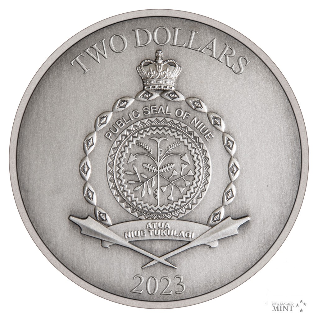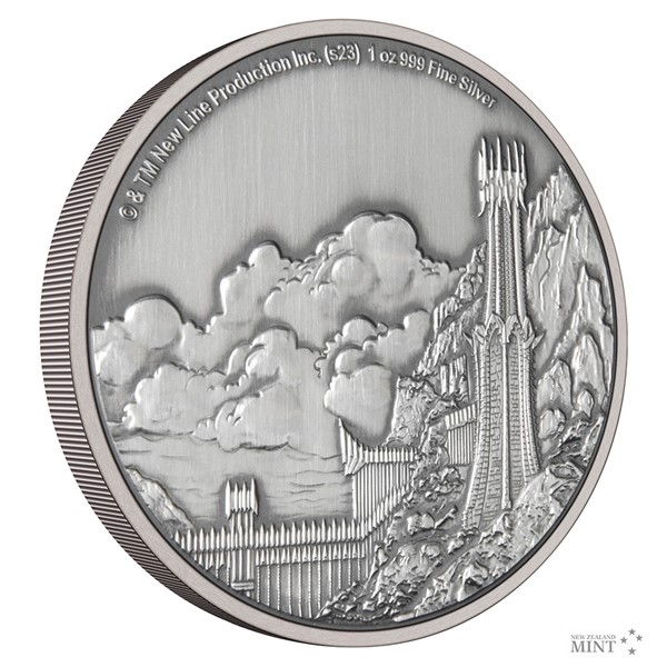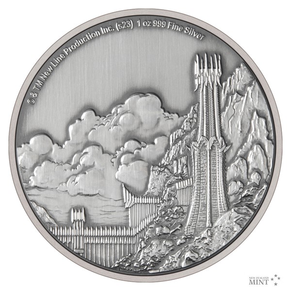 Reverzní straně mince vévodí průsmyk Cirith Gorgor chráněný Černou bránou a Zubovými věžemi. Reliéf je patinovaný, což dává vyniknout i těm nejmenším detailům. Averz je pak věnován nezbytným atributům emitenta, kterým je ostrov Niue – tedy státnímu znaku, nominální hodnotě TWO DOLLARS (NZD) a roku emise 2023. Minci v oficiální filmové licenci vyrazil tým Novozélandské mincovny.