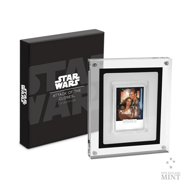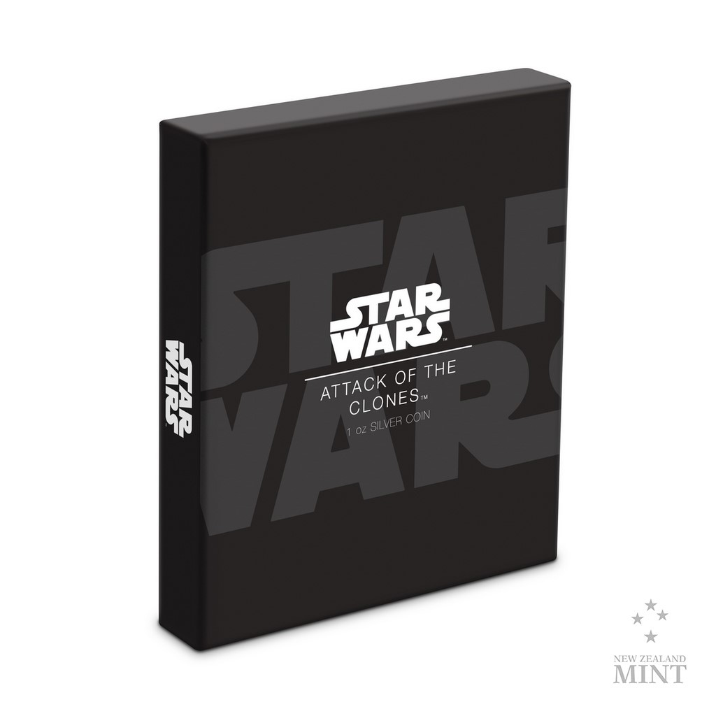 Pamětní mince netradičního obdélníkového tvaru má podobu filmového plakátu. V atraktivním kolorování se vyjímají všechny hlavní postavy – Anakin Skywalker, jeho láska Padmé, mistři Obi-Wan Kenobi, Yoda a Mace Windu, droidi R2-D2 a C-3PO a námezdní lovec Jango Fett. Pochopitelně nemohou chybět ani titulární klony, a to v reliéfním provedení. Averzní strana mince patří nezbytným náležitostem jejího emitenta, tichomořského ostrova Niue – jsou jimi profil a jméno královny Alžběty II., letopočet vydání mince 2018 a nominální hodnota 2 DOLLARS (NZD). Autorem oficiálně licencované ražby je designový kolektiv Novozélandské mincovny.