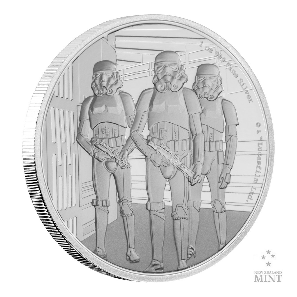 Reverzní strana mince předkládá trojici stormtrooperů ozbrojených blastery na palubě Hvězdy smrti. Averz mince pak patří náležitostem emitenta, kterým je tichomořský ostrov Niue – portrétu a jménu panovnice Alžběty II., roku emise 2019 a nominální hodnotě TWO DOLLARS (NZD). Oficiálně licencovaná ražba je dílem výtvarného týmu Novozélandské mincovny.