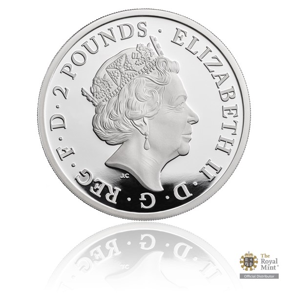 Reverzní straně mince vévodí Britannia v plné zbroji, jejíž tělo má podobu mapy britských ostrovů. Na pozadí je pak patrná ještě vlajka Velké Británie a v pravé části reverzu se nachází speciální jubilejní značka – trojzubec s číslovkou 20. Autorem originálního výtvarného návrhu se stal mladý designér Louis Tamlyn. Averzní strana mince náleží atributům emitenta – tj. nominální hodnotě 2 POUNDS (GBP), portrétu královny Alžběty II. a textu „ELIZABETH II D G REG F D“ (Alžběta II., z Boží milosti královna, ochránkyně víry).