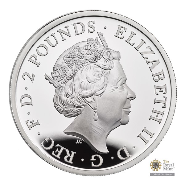 Reverzní straně mince, jejíž podoba je dílem ilustrátora P. J. Lynche, vévodí klečící postava Britannie. Sveřepou ženu, která je tradičně vyzbrojena trojzubcem, přilbou a štítem, doprovází lev coby symbol odvahy. Averzní strana mince náleží atributům emitenta – tj. nominální hodnotě 2 POUNDS (GBP), portrétu královny Alžběty II. a textu „ELIZABETH II D G REG F D“ (Alžběta II., z Boží milosti královna, ochránkyně víry).