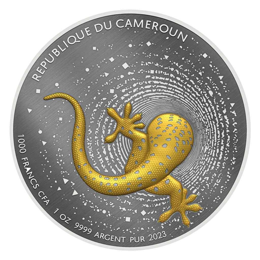 Pamětní mince s motivem gekona má ezoterickou myšlenku. Zatímco averzní strana představuje jednu realitu, reverz je odrazem jiného času a prostoru. Gekonovo mrštné tělo, které je pro kontrastní efekt pozlaceno, prochází mezi těmito dvěma dimenzemi. To vše je zpracováno ve vysokém reliéfu. Protože mince vychází v zahraniční licenci státu Kamerun, nese na averzní straně ještě opis REPUBLIQUE DU CAMEROUN a nominální hodnotu 1000 FRANCS CFA (XAF).