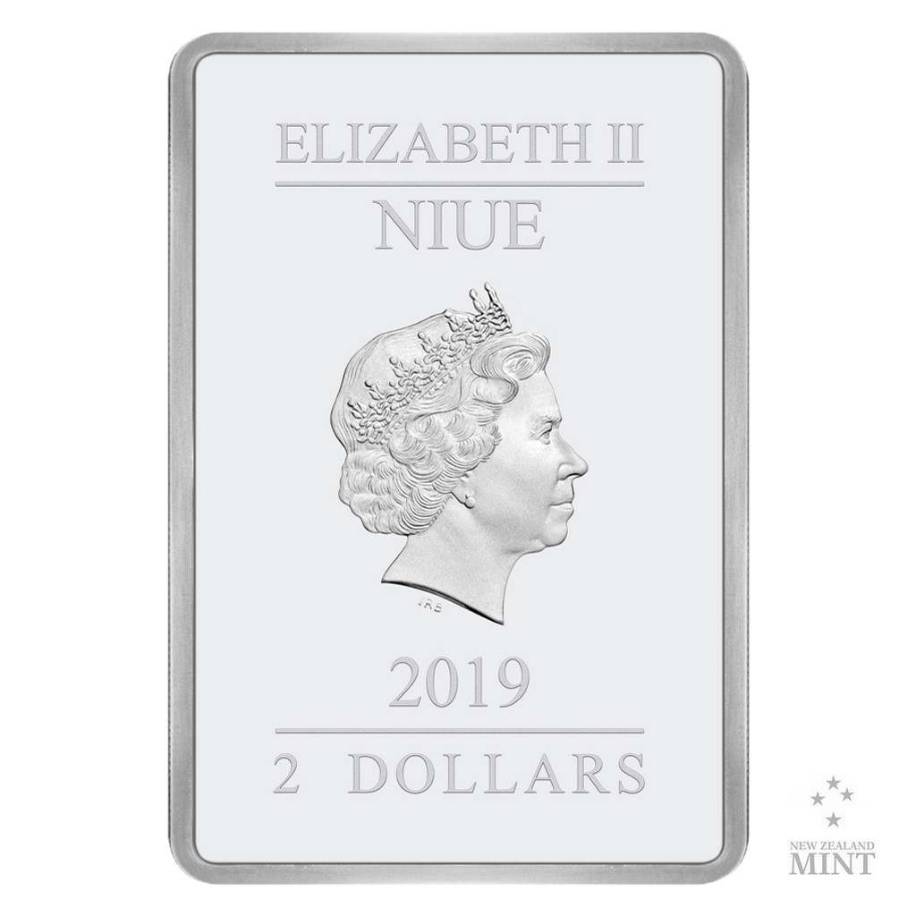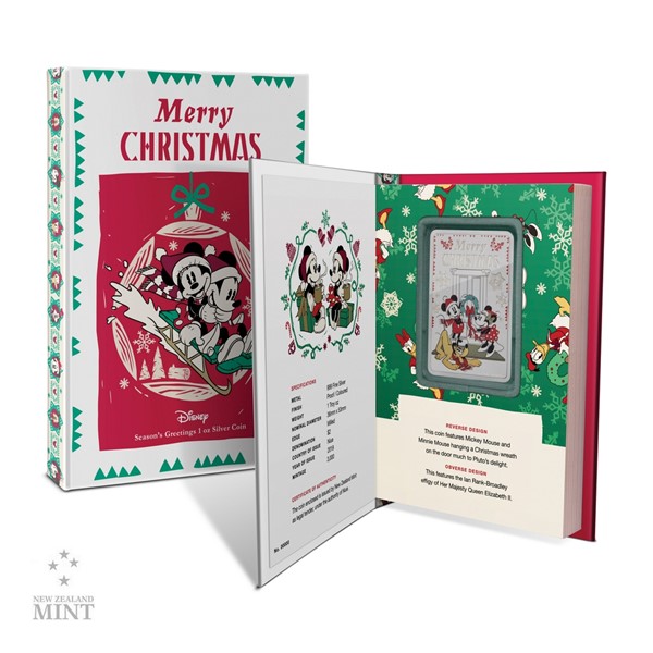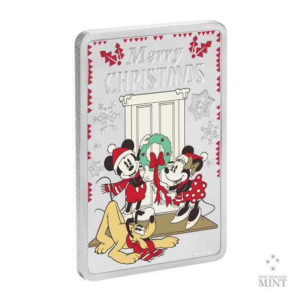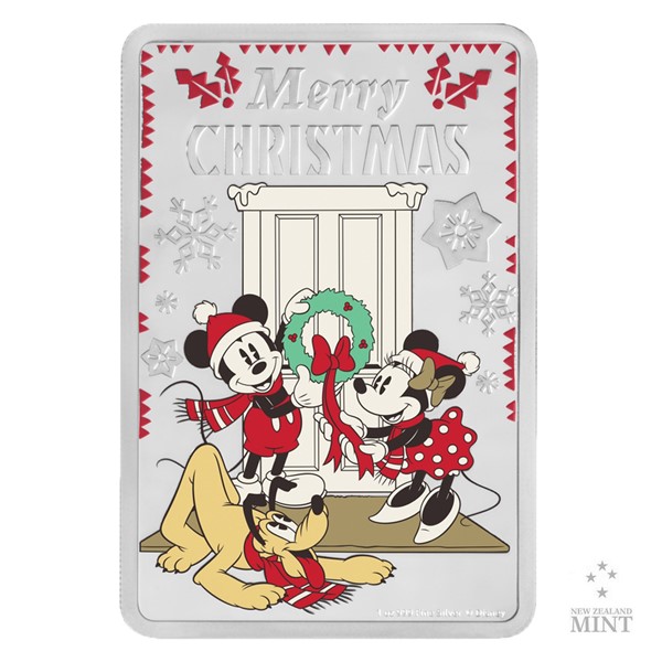 Netradiční obdélníková mince nese barevnou ilustraci vyvedenou v retro stylu starých grotesek. Mickey a Minnie věší na dveře vánoční věnec, z čehož má největší radost pes Pluto. Kompozici dotváří řada sněhových vloček a anglický nápis MERRY CHRISTMAS (veselé Vánoce). Averzní strana pak předkládá atributy emitenta mince, kterým je ostrov Niue – tedy portrét a jméno královny Alžběty II., rok vydání 2019 a nominální hodnotu 2 DOLLARS (NZD). Oficiálně licencovaná mince je dílem výtvarného týmu Novozélandské mincovny.