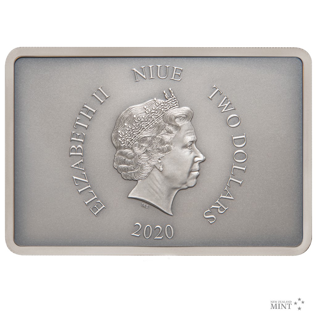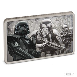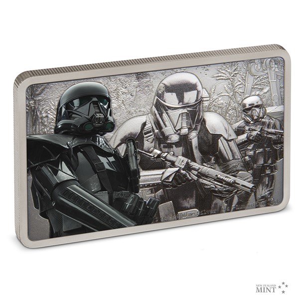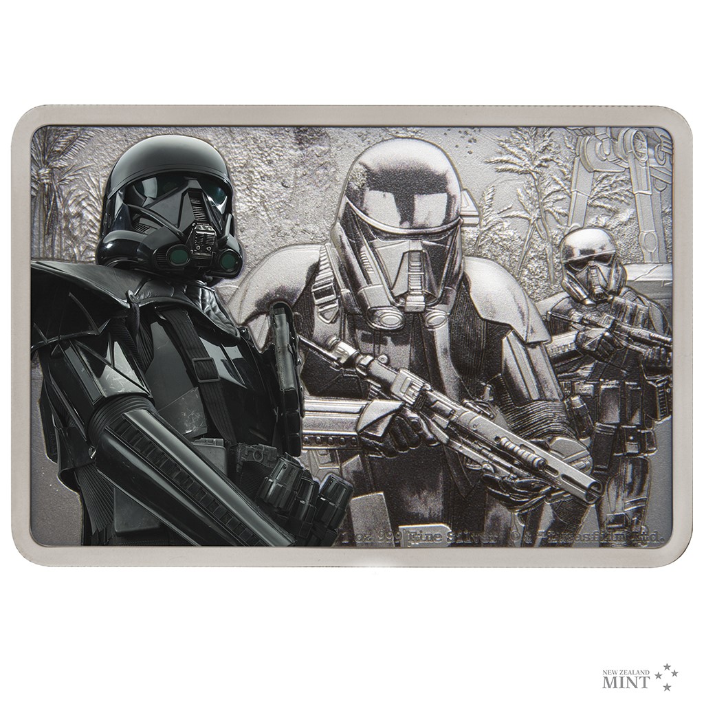 Reverzní strana obdélníkové mince zkrášlené patinou předkládá kolorovanou polopostavu deathtroopera. Plastický reliéf na pozadí pak předkládá jeho spolubojovníky při bitvě o planetu Scarif. Vydavatelem mince je tichomořský ostrov Niue, a její averzní strana proto nese jeho atributy – portrét a jméno královny Alžběty II., rok vydání mince 2020 a nominální hodnotu TWO DOLLARS (NZD). Podoba oficiálně licencované ražby je dílem výtvarného kolektivu New Zealand Mint.