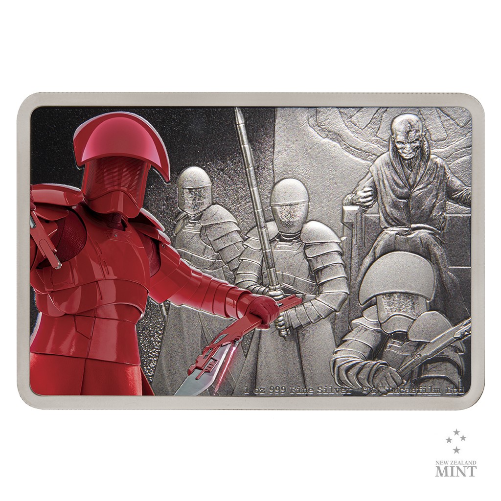 Reverzní strana obdélníkové mince zkrášlené patinou předkládá kolorovanou polopostavu pretoriána, který svírá čepel. V plastickém reliéfu na pozadí je pak nastoupena trojice jeho druhů a z trůnu na ně shlíží nejvyšší vůdce Snoke. Vydavatelem mince je tichomořský ostrov Niue, a její averzní strana proto nese jeho atributy – portrét a jméno královny Alžběty II., rok vydání mince 2020 a nominální hodnotu TWO DOLLARS (NZD). Podoba oficiálně licencované ražby je dílem výtvarného kolektivu New Zealand Mint.
