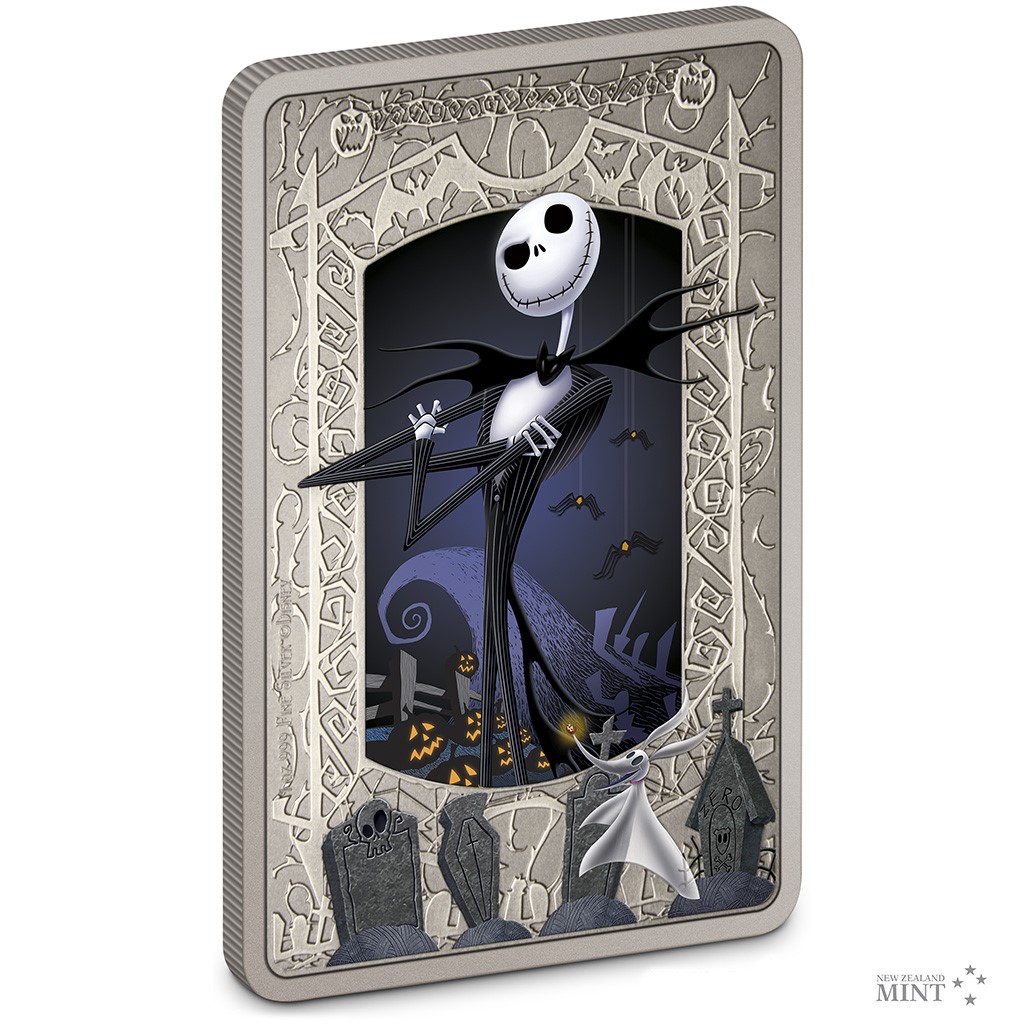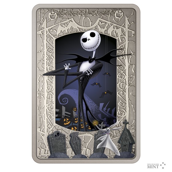 Reverzní strana netradiční obdélníkové mince předkládá nejen kostlivce Jacka Skellingtona, ale také jeho přízračného psa Zera, který poletuje mezi náhrobky. Zatímco postavičky jsou vyvedeny v barvě, halloweenský rámeček mince je reliéfní. Averz pak nese nezbytné atributy emitenta, kterým je ostrov Niue – tedy jméno a portrét královny Alžběty II., nominální hodnotu TWO DOLLARS (NZD) a rok emise 2021. Minci v oficiální licenci vyrazil tým Novozélandské mincovny.