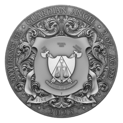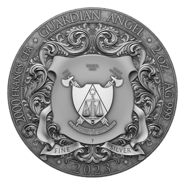 Reverzní strana mince předkládá anděla strážného, který dohlíží na dvě děti ve světě zničeném lidskou krutostí, bezohledností a lhostejností. Pozlacené perutě přitom slouží jako štít před raketami a bombami. Bohatě dekorovaná averzní strana je pak věnována nezbytným atributům emitenta mince, kterým je stát Kamerun – nese jeho státní znak, nominální hodnotu 2000 FRANCS CFA (XAF) a letopočet emise 2023. To vše se vyjímá ve vysokém reliéfu zkrášleném patinou.