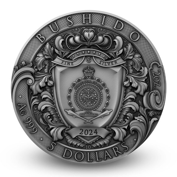Reverzní strana mince předkládá samuraje s tasenou katanou. V pozadí za ním vychází slunce, které je symbolem Japonska, přičemž bojovník odhodlaný prolít krev kontrastuje s okolní krajinou posetou starobylými stromy a tichými chrámy. Bohatě dekorovaná averzní strana je pak věnována nezbytným atributům emitenta mince, kterým je ostrov Niue – nese jeho státní znak, nominální hodnotu 5 DOLLARS (NZD) a letopočet emise 2024. To vše se vyjímá ve vysokém reliéfu zkrášleném patinou a pozlacením.