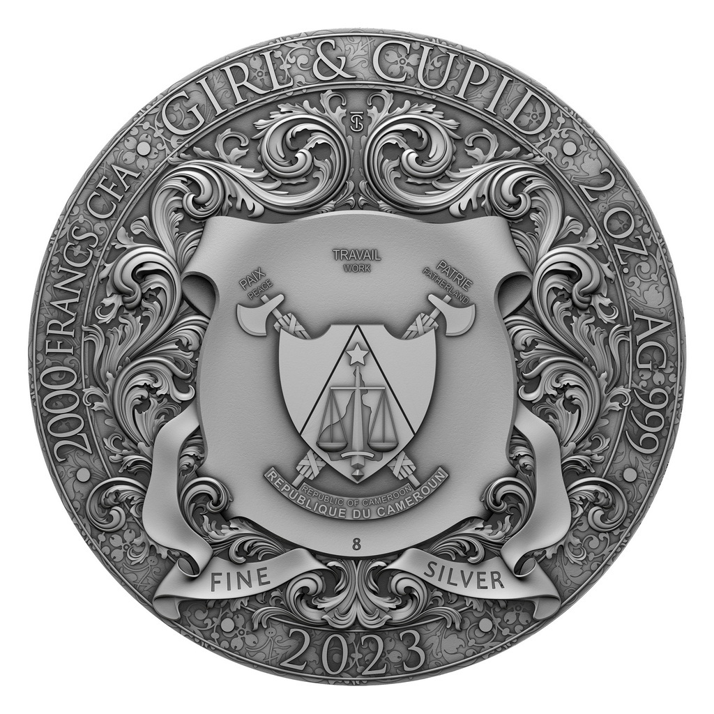 Na reverzní straně mince, která je reliéfní rekonstrukcí historického obrazu, je věrně zachycen dívčin výraz – okamžik mezi vzrušeným očekáváním a váhavým strachem z lásky. Amorovy perutě vynikají díky selektivnímu pozlacení. Bohatě dekorovaná averzní strana je pak věnována nezbytným atributům emitenta mince, kterým je stát Kamerun – nese jeho státní znak, nominální hodnotu 2000 FRANCS CFA (XAF) a letopočet emise 2023. To vše se vyjímá ve vysokém reliéfu zkrášleném patinou.