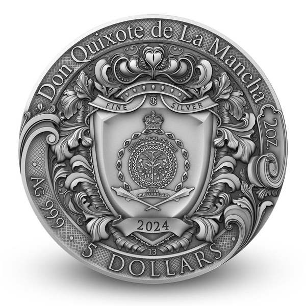 Reverzní straně mince vévodí sám Don Quijote v obležení svých iluzí. Nejasnou hranici mezi fakty a fikcí symbolizuje krempa klobouku, která plynule přechází ve španělskou krajinu. Rytíř jedoucí na své klisně Rocinantě, kterého doprovází sluha Sancho Panza na oslovi, potkává lva či bičovaného pacholka. V reliéfu pochopitelně nemohou chybět ani slavné větrné mlýny, které hrdina zaměnil za obry. Zvláštní pozornost je věnována ještě Dulcinee – lásce Dona Quijota, která je vyobrazena v pozlaceném medailonu. Bohatě dekorovaná averzní strana je pak věnována nezbytným atributům emitenta mince, kterým je ostrov Niue – nese jeho státní znak, nominální hodnotu 5 DOLLARS (NZD) a letopočet emise 2024. To vše se vyjímá ve vysokém reliéfu zvýrazněném patinou.
