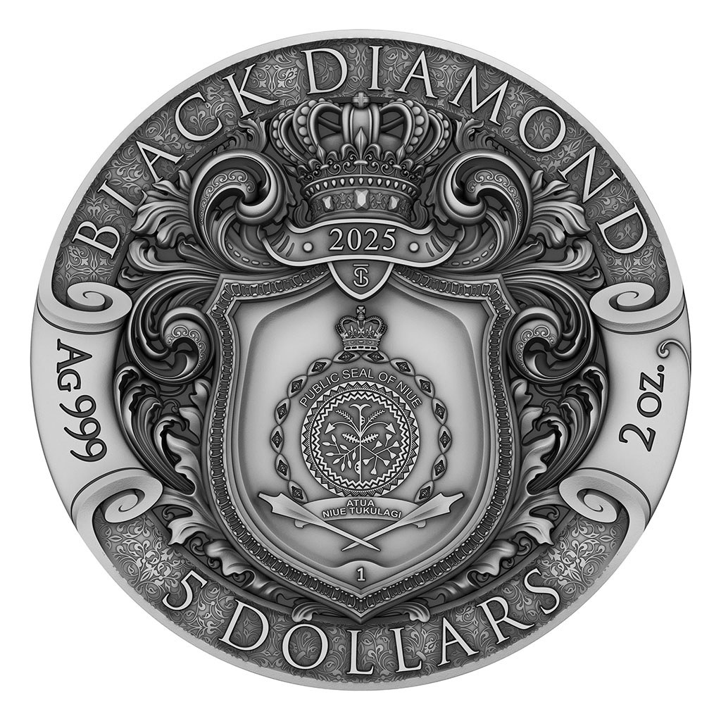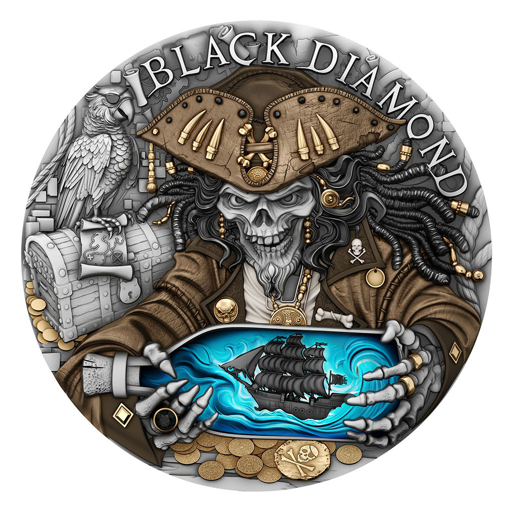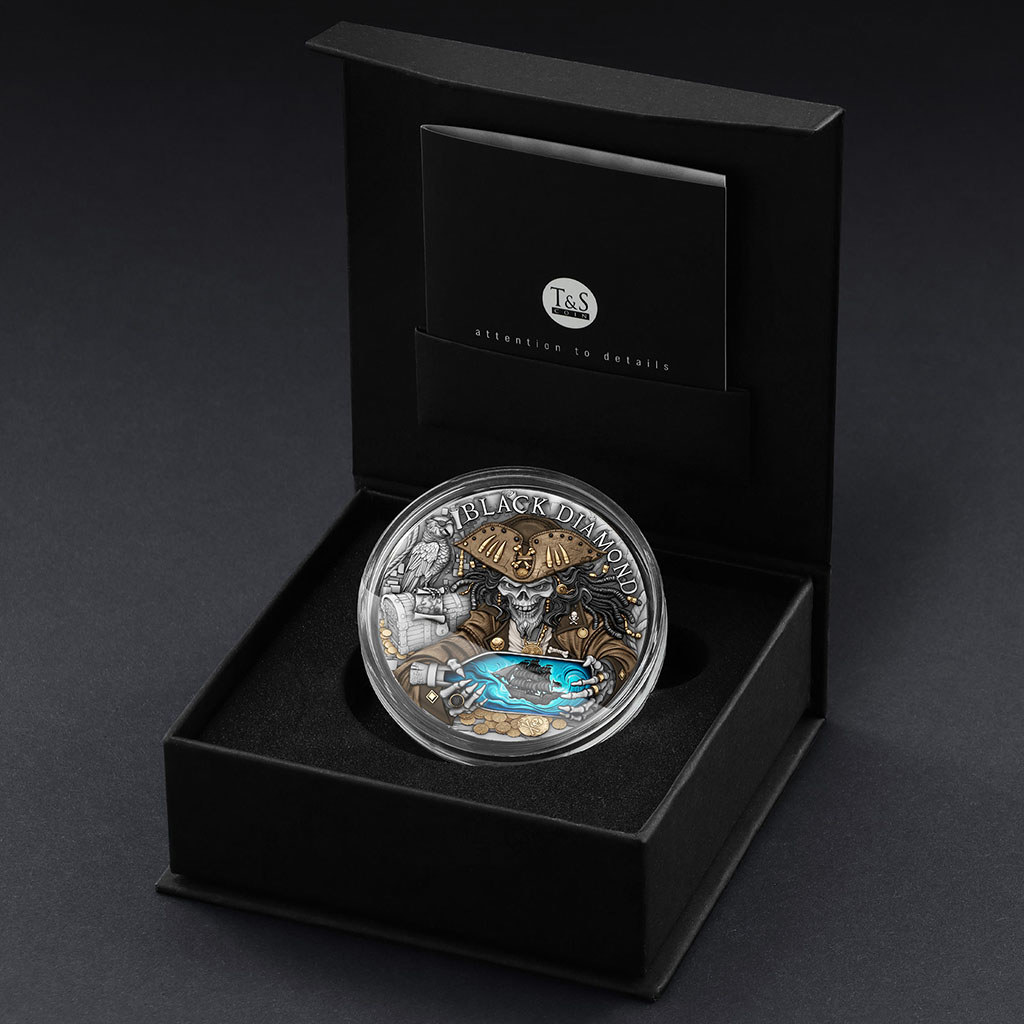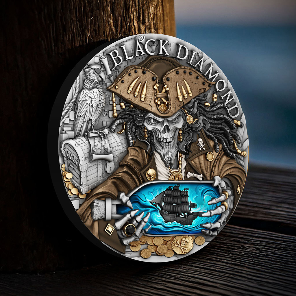 Někteří piráti byli natolik obávaní, že v nich lidé viděli spíše démony, a právě takového přízračného bukanýra najdete na reverzní straně mince. Na prostředníčku kostlivé ruky, která svírá loď v lahvi, se vyjímá skutečný poklad – prsten osazený opravdovým černý diamantem. V okolním reliéfu pak najdete celou řadu typických pirátských atributů – truhlici, rozsypané mince, papouška a mapu ostrova pokladů. Bohatě dekorovaná averzní strana je pak věnována nezbytným atributům emitenta mince, kterým je ostrov Niue – nese jeho státní znak, nominální hodnotu 5 DOLLARS (NZD) a letopočet emise 2025. To vše se vyjímá ve vysokém reliéfu zvýrazněném patinou, selektivním pozlacením i UV potiskem.