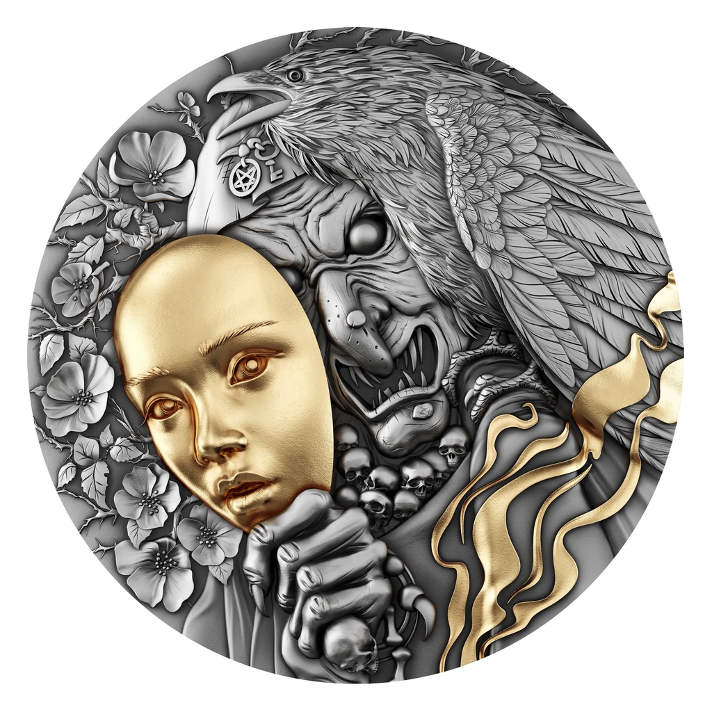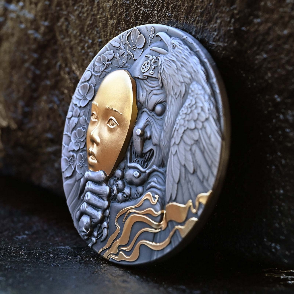 Reverzní strana mince předkládá škaredou čarodějnici, která svou děsivou tvář skrývá za pozlacenou maskou krásné dívky. Bohatě dekorovaná averzní strana je pak věnována nezbytným atributům emitenta mince, kterým je ostrov Niue – nese jeho státní znak, nominální hodnotu 5 DOLLARS (NZD) a letopočet emise 2023. To vše se vyjímá ve vysokém reliéfu zkrášleném patinou.