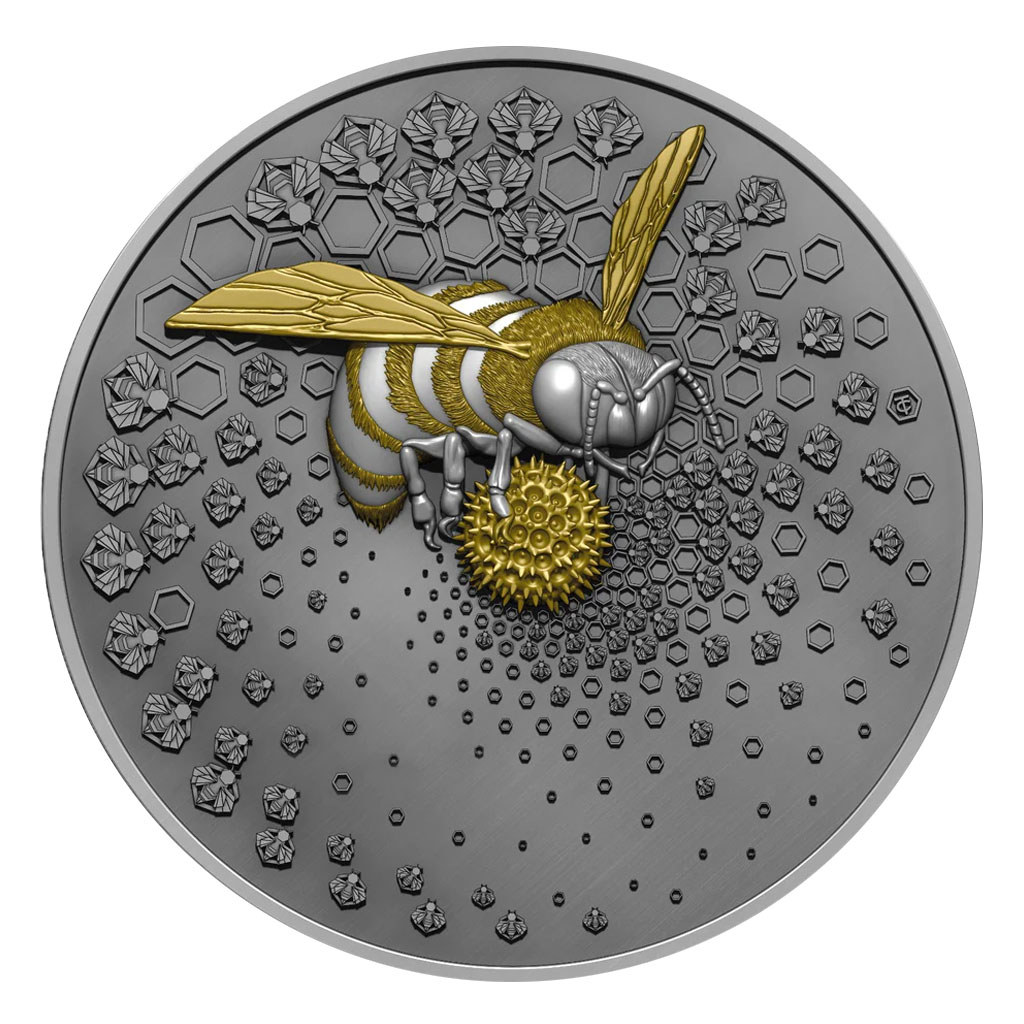 Okolní mincovní plocha je pak poseta desítkami drobných včelek a šestihranů,