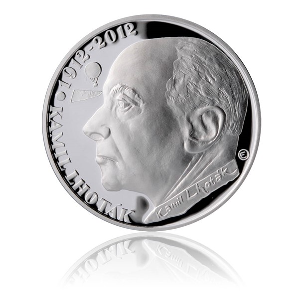 Stříbrná dvousetkorunová mince připomínající 100. výročí narození Kamila Lhotáka je v pořadí čtvrtou z pětice dvousetkorunových mincí vydávaných Českou národní bankou v roce 2012. Umělecký návrh vzešel z celostátní anonymní soutěže vyhlášené ČNB, jejímž vítězem se stala výtvarnice Tereza Eisnerová.