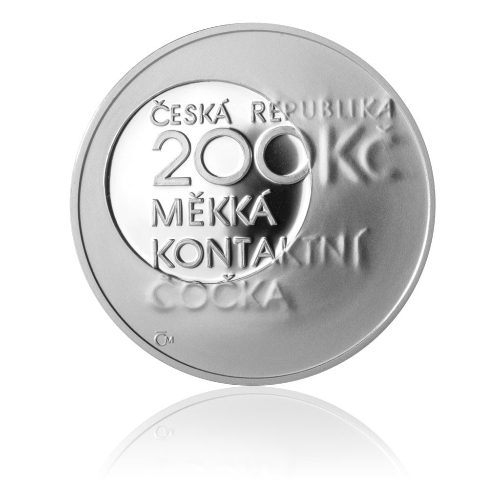Na averzní straně mince se nachází nominál 200 Kč, Česká republika a text: Měkké kontaktní čočky.