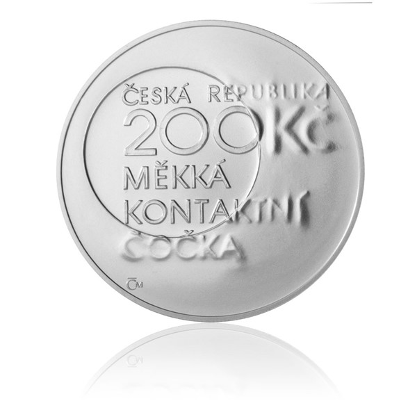 Na averzní straně mince se nachází nominál 200 Kč, Česká republika a text: Měkké kontaktní čočky.