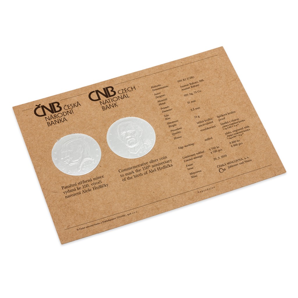 V roce 2019 si připomínáme 150. výročí narození Aleše Hrdličky, jednoho z nejvýznamnějších vědců s českými kořeny. Světoznámému antropologovi je při této příležitosti věnována stříbrná mince České národní banky s nominální hodnotou 200 Kč vyražená v provedení proof.