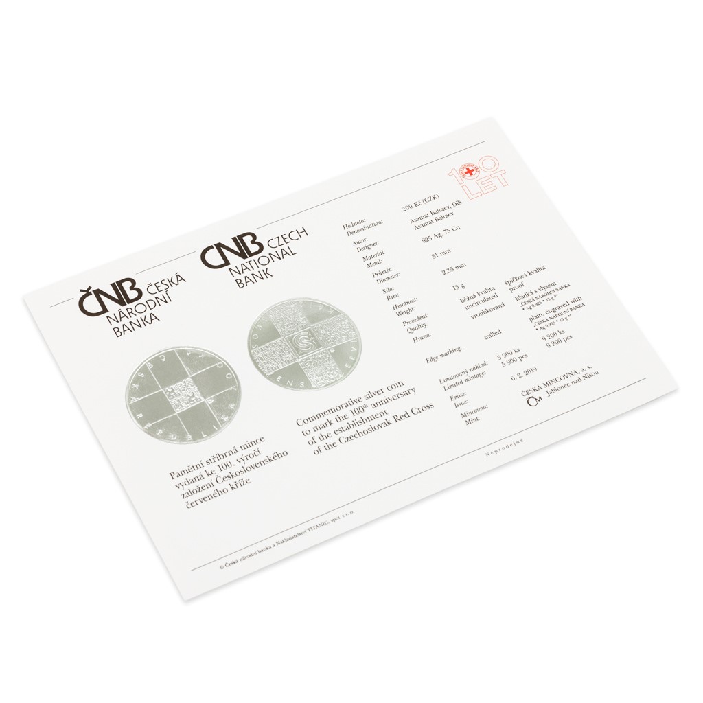 Československá odnož mezinárodního Červeného kříže vznikla 6. února 1919. O rovných 100 let později vydává Česká národní banka stříbrnou pamětní minci s nominální hodnotou 200 Kč vyraženou ve špičkové kvalitě proof.