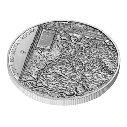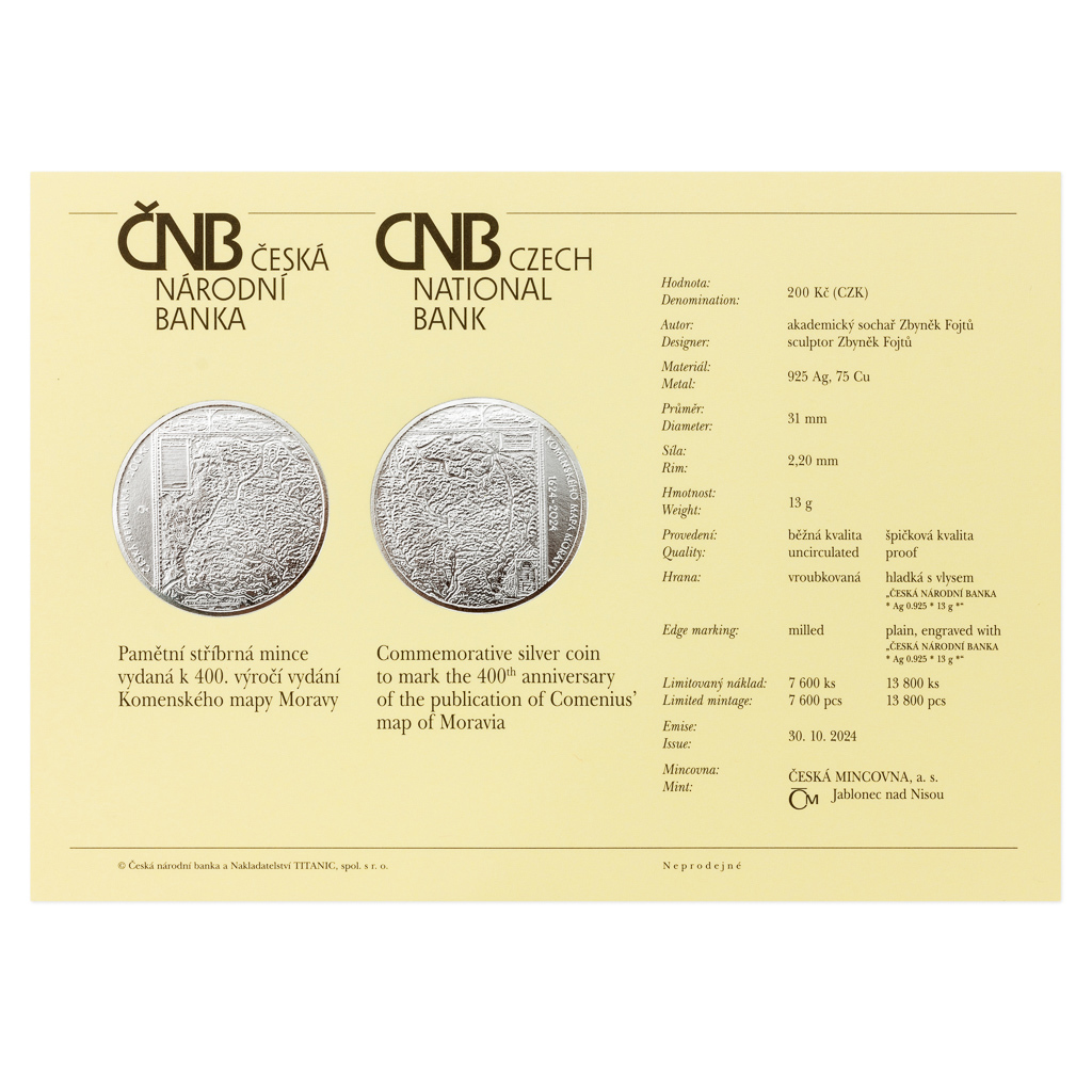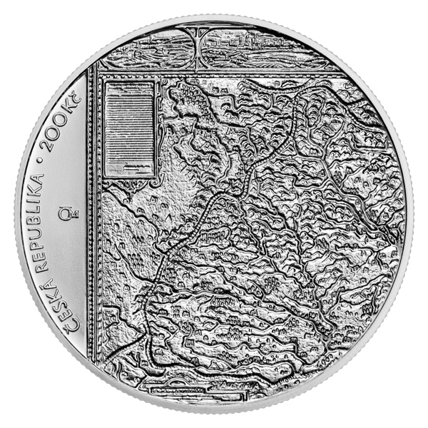 Stříbrná mince České národní banky s nominální hodnotou 200 Kč, která je ražena v kvalitě standard, připomíná 400. výročí vydání Komenského mapy Moravy.