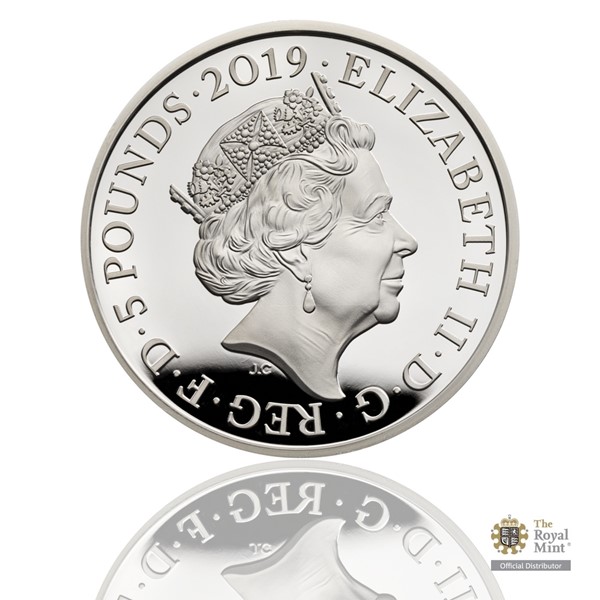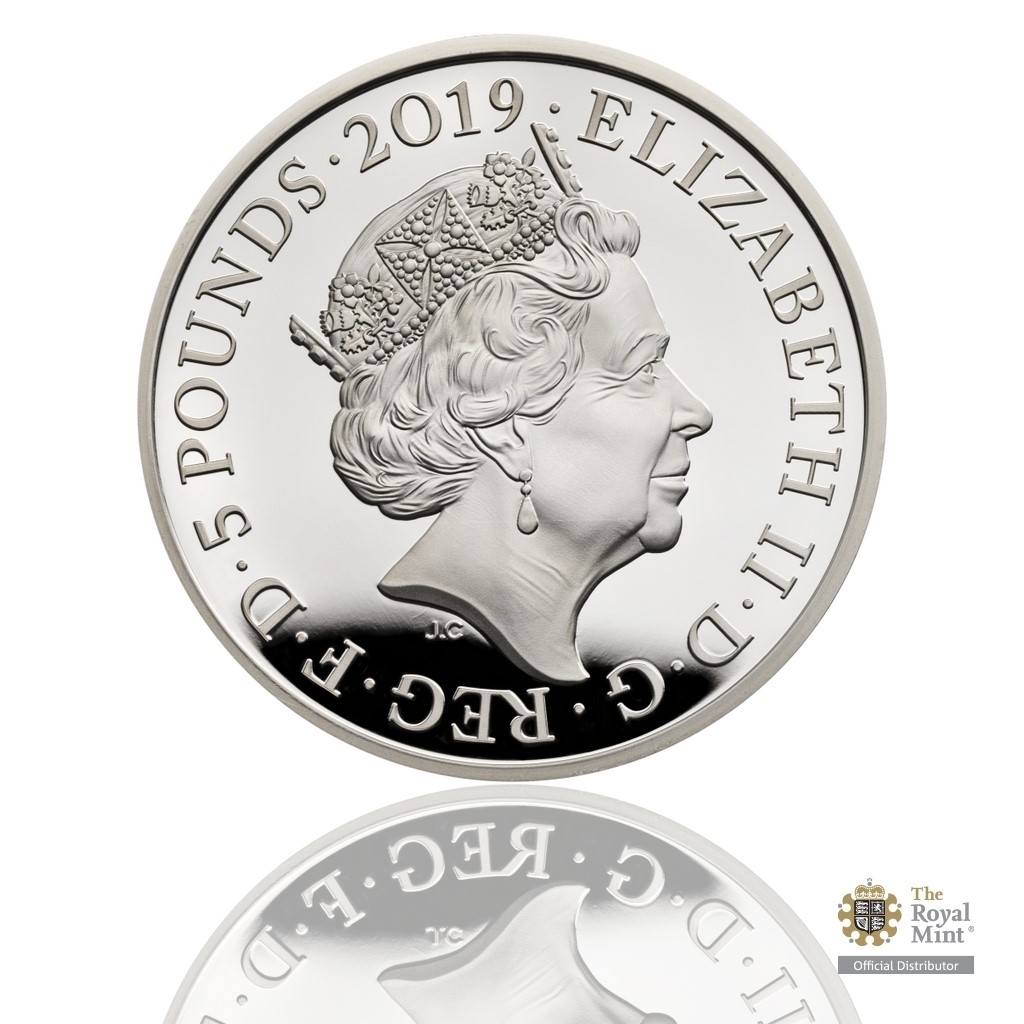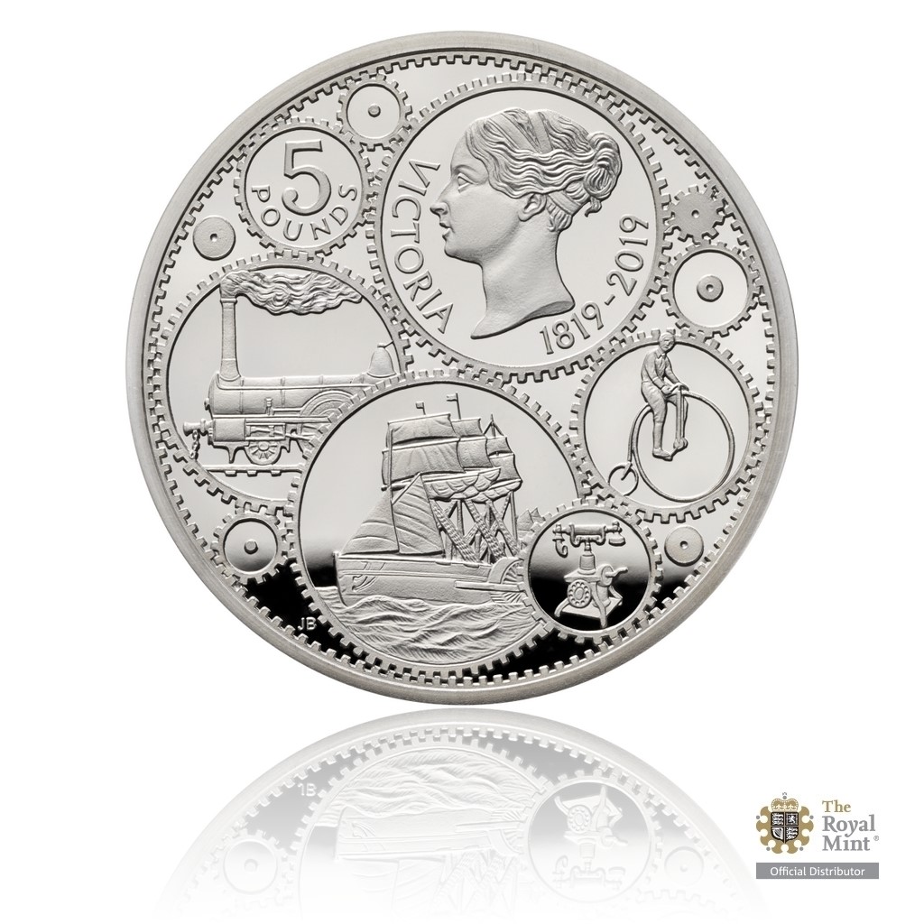 Na reverzní straně mince z ateliéru Johna Bergdahla se nachází hodinový strojek symbolizující průmyslovou revoluci. Do jednotlivých ozubených koleček jsou zakomponovány dobové výjevy – portrét královny Viktorie z profilu a technické výdobytky viktoriánské éry. Averzní strana pak nese nominální hodnotu 5 POUNDS (GBP), portrét současné královny Alžběty II., opis „ELIZABETH II D G REG F D“ (Alžběta II., z Boží milosti královna, ochránkyně víry) a ročník emise 2019.