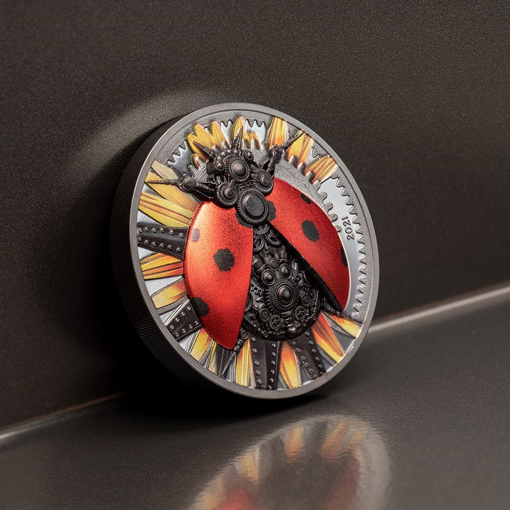 Inovativní stříbrná mince, která působivě kombinuje přírodní a umělé motivy, se zamýšlí nad tím, kudy by se ubírala evoluce, kdyby do ní zasáhl člověk. Jejím ústředním prvkem je mechanická beruška.