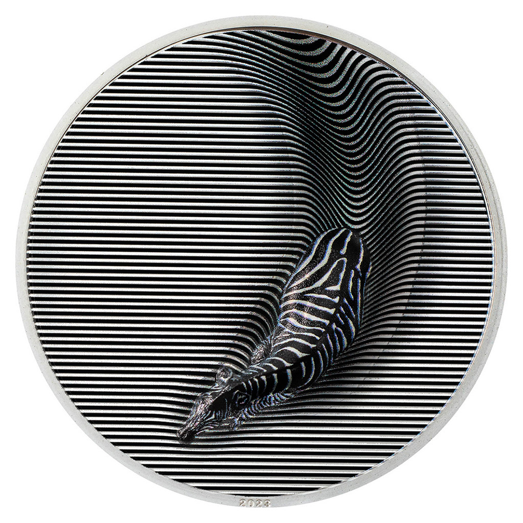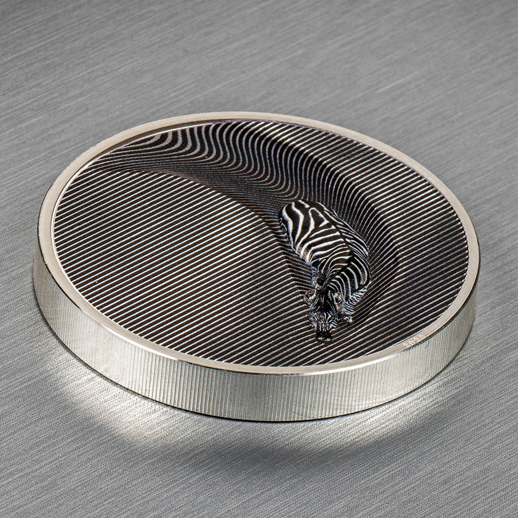 Hypnotická stříbrná mince s motivem zebry vzdává hold nápaditosti přírodní kamufláže.