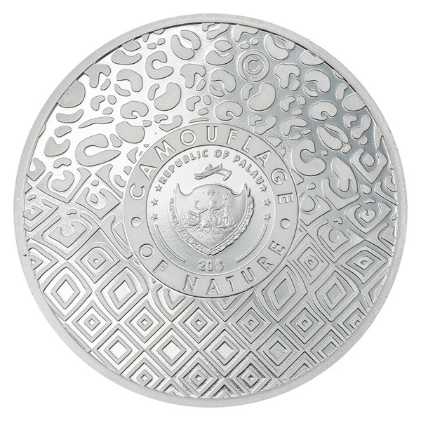 Reverzní strana pamětní mince je černobíle pruhovaná, přičemž symetrický vzor rozráží běžící zebra. Díky optické iluzi mince působí barevným dojmem, i když ve skutečnosti není kolorovaná. Averzní stranu pak vyplňují abstraktní obrazce, které pozvolna přecházejí ve zvířecí kamufláž. Doprostřed averzu jsou zakomponovány ještě atributy emitenta mince – státní znak republiky Palau a nominální hodnota 20$ (USD). To vše je zpracováno v hlubokém reliéfu.