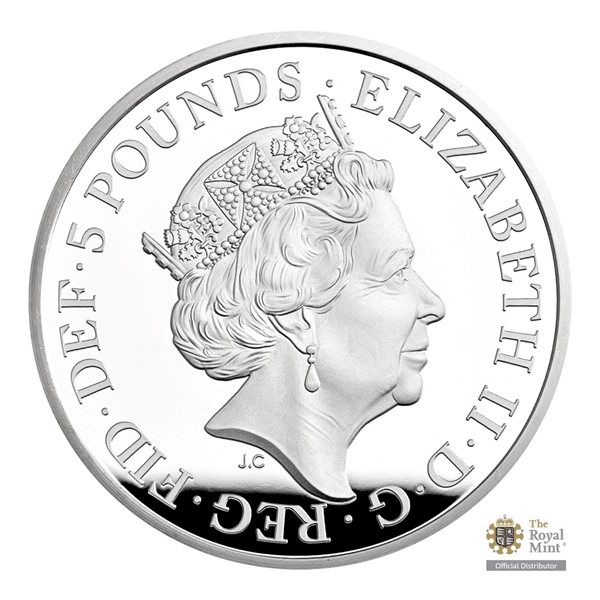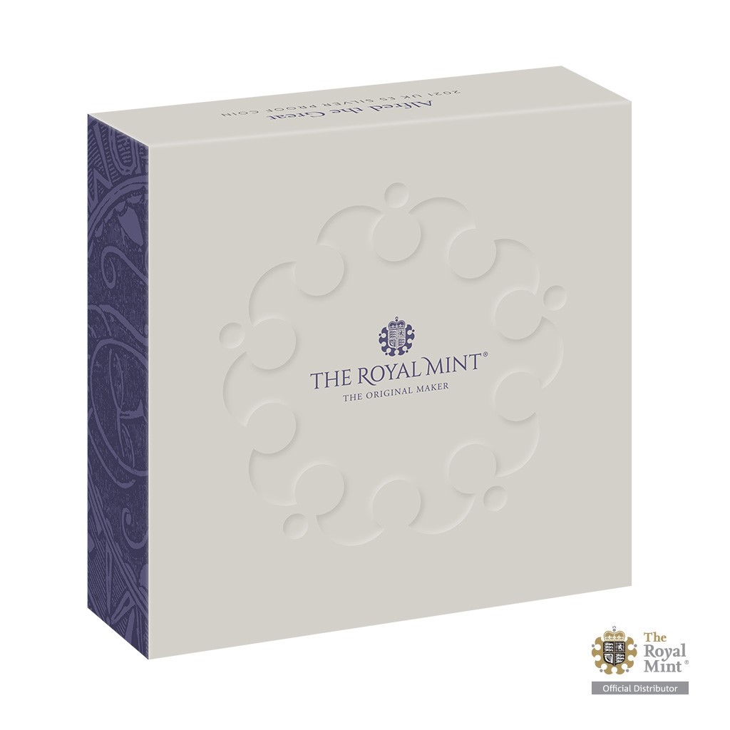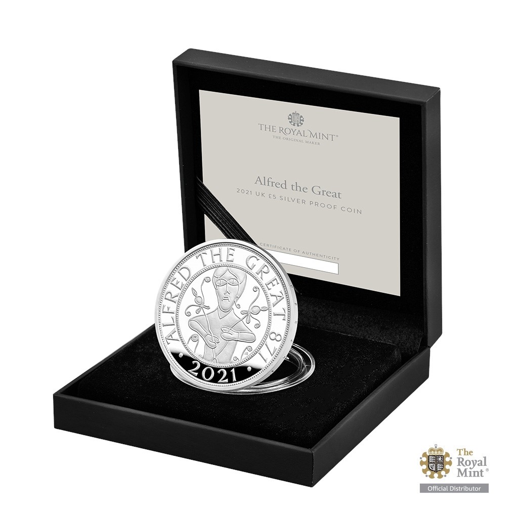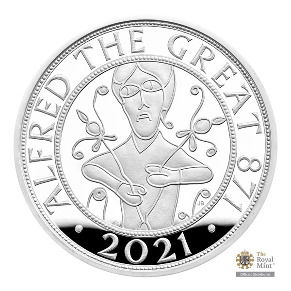 Reverzní strana mince, kterou zpracoval sochař John Bergdahl, je inspirována takzvaným Alfrédovým klenotem, jenž je unikátním dokladem zručnosti anglosaských šperkařů v 9. století. Opis uvádí královo jméno ALFRED THE GREAT a výroční letopočty 871–2021. Averzní strana mince je pak věnována atributům emitenta – tj. portrétu královny Alžběty II., textu ELIZABETH II D G REG FID DEF (Alžběta II., z Boží milosti královna, ochránkyně víry) a nominální hodnotě 5 POUNDS (GBP).