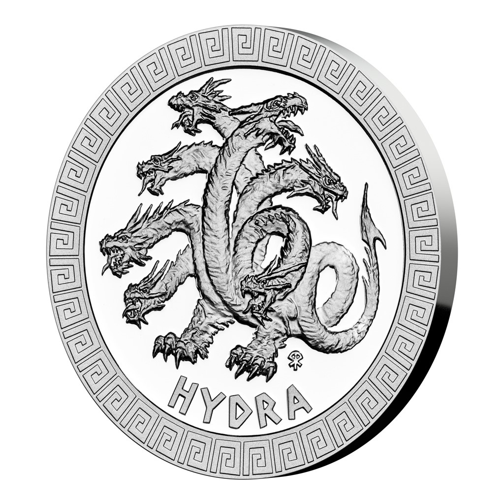 Medailér Asamat Baltaev, DiS., umístil na reverzní stranu mince obludu s řadou syčících hlav a doprovodil ji opisem HYDRA. Není bez zajímavosti, že ražba nemá klasický mincovní rámeček – namísto něj je reliéf obklopen ozdobnými helénskými ornamenty, které prostupují celým sběratelským cyklem. Protože mince České mincovny vycházejí v zahraniční licenci ostrova Niue, nesou na averzní straně jméno a profil panovnice Alžběty II., nominální hodnotu 2 DOLLARS (NZD) a rok emise 2021.