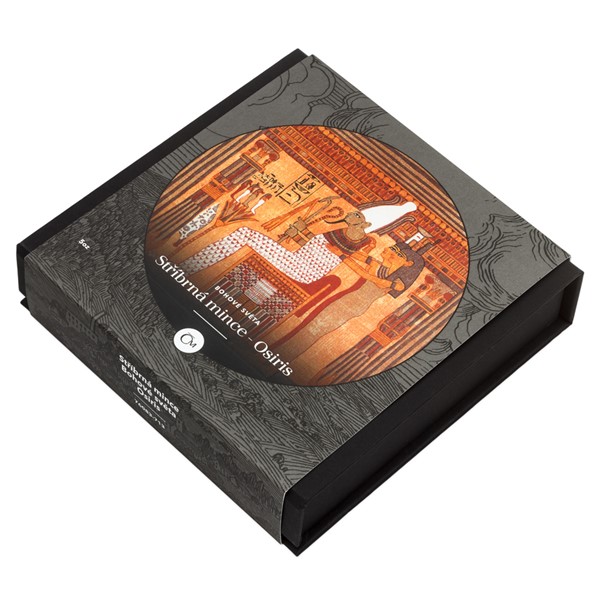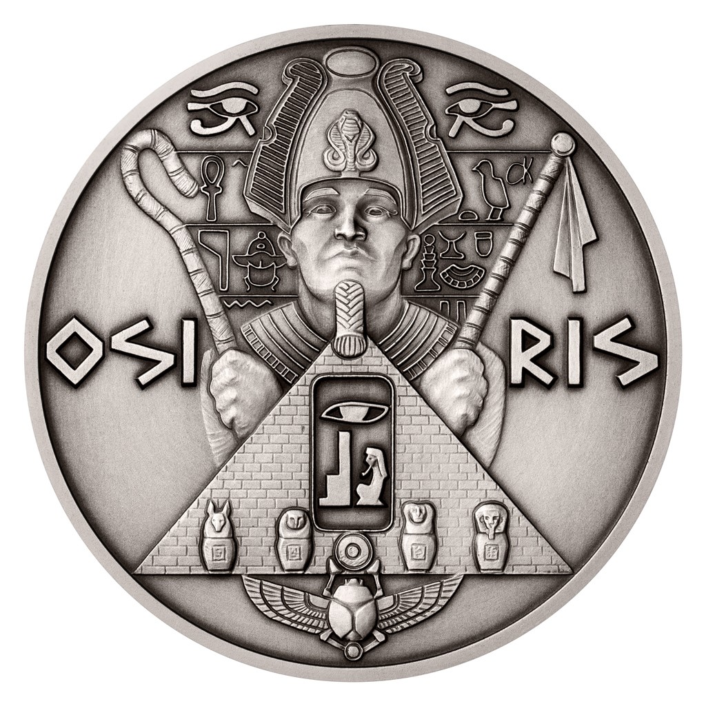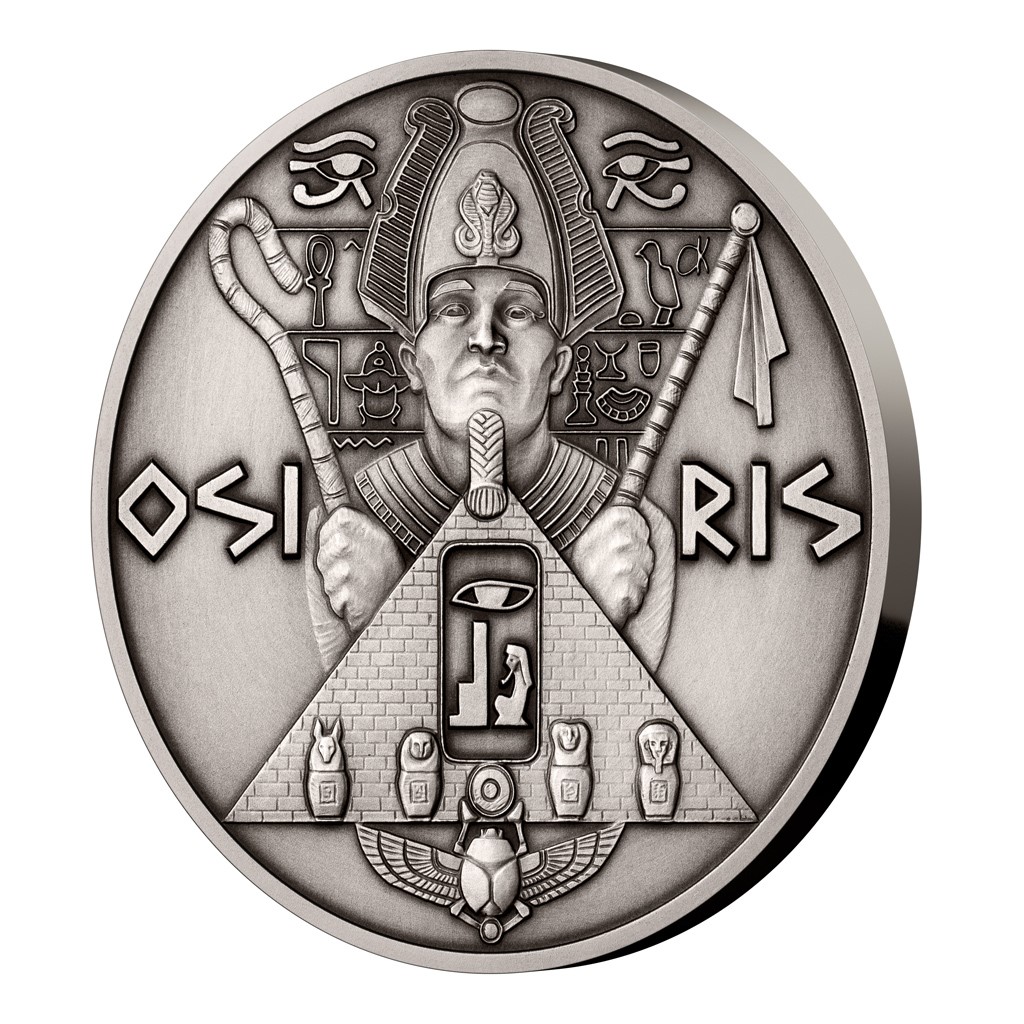 Dalším starodávným bohem, kterému vzdává hold patinovaná stříbrná mince z tematického cyklu České mincovny, je Osiris.