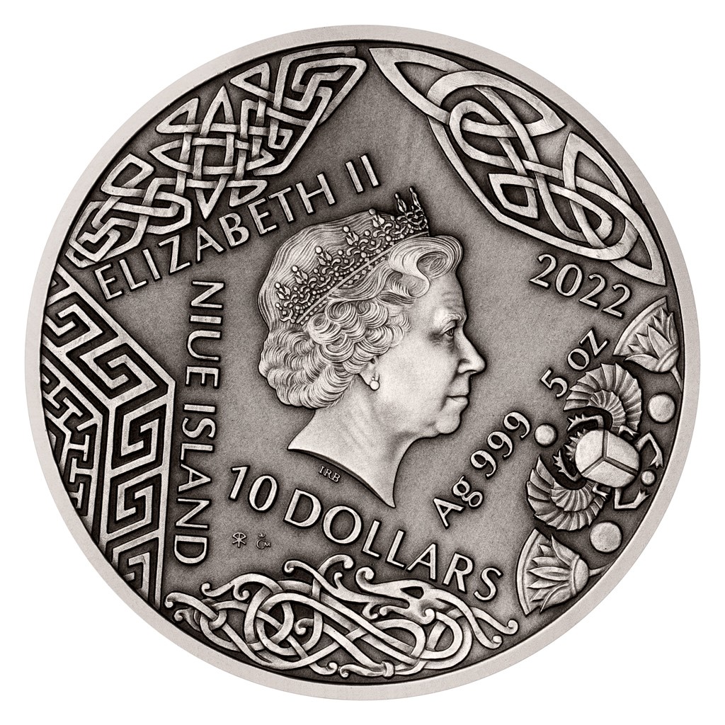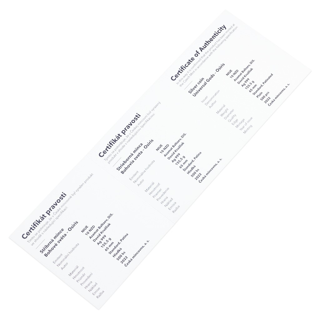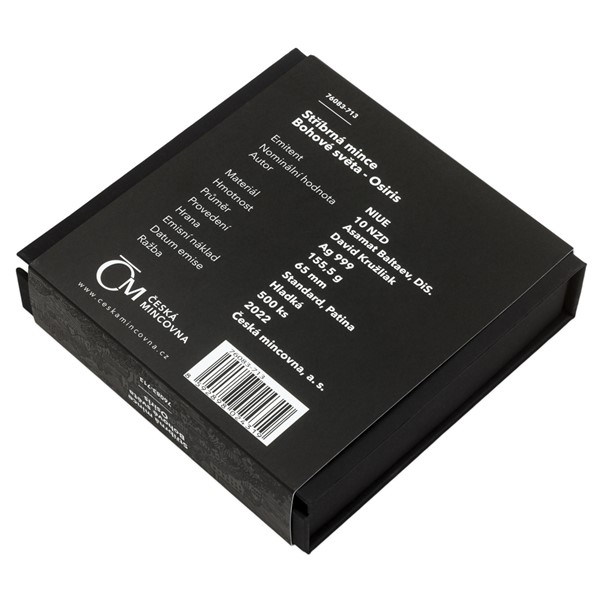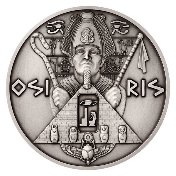 Osiris byl úplně první mumií v dějinách, což významně ovlivnilo jeho podobu v umění. Bývá vyobrazován nabalzamovaný a na rozdíl od jiných egyptských bohů nemá zvířecí rysy. Také medailér David Kružliak mu přisoudil podobu muže zabaleného v obinadlech, který má po ruce řadu panovnických artefaktů – korunu s posvátnou kobrou, falešný vous, berlu a důtky. Kompozici reverzní strany mince dotváří propracovaná egyptská symbolika – v reliéfu nechybí pyramida, kanopy, skarabeus ani řada hieroglyfů, které znalcům egyptského písma vyprávějí Osiridův příběh. Dekorativní egyptské motivy najdete také na averzní straně mince, kde je doprovázejí ornamenty řeckého, severského, slovanského a egyptského původu – averz je totiž společný celému ročníku božských mincí. Protože mince České mincovny vycházejí v licenci zahraničního emitenta, kterým je ostrov Niue, nese averz ještě jeho náležitosti – nominální hodnotu 10 DOLLARS (NZD), jméno a portrét královny Alžběty II. a rok emise 2022.