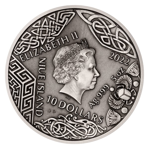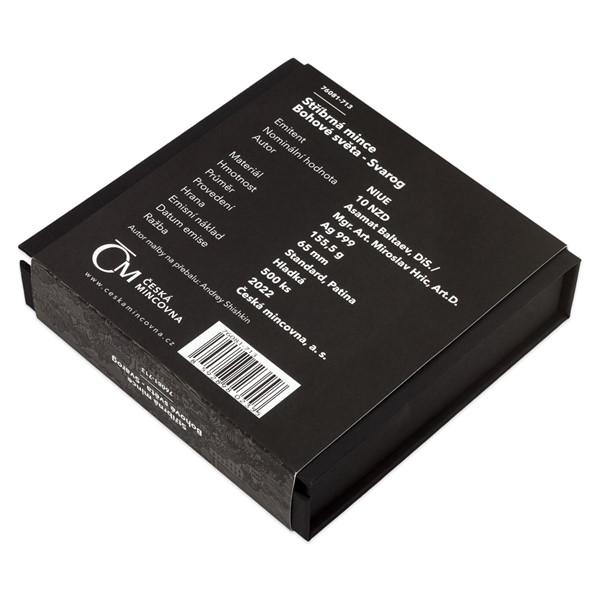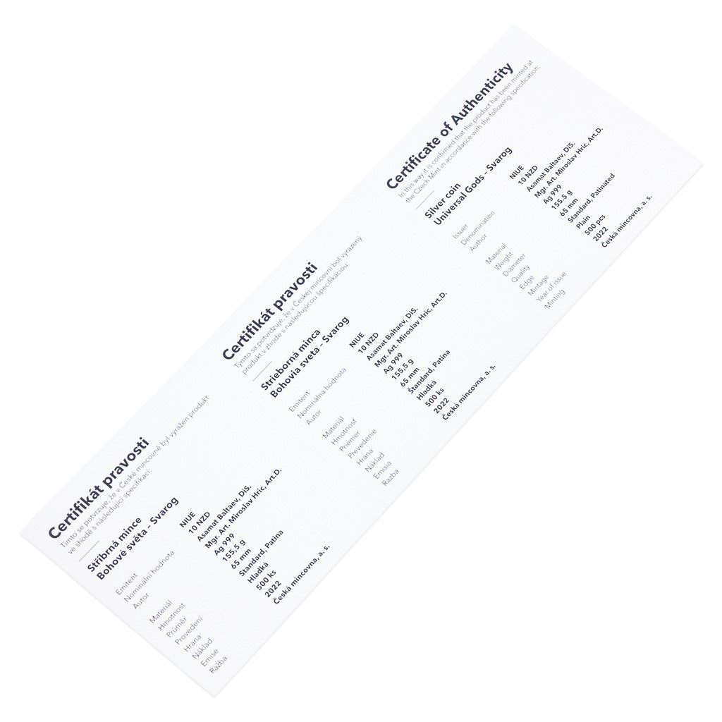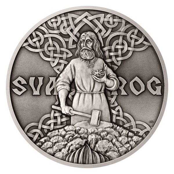 Reverzní strana mince, která je dílem medailéra Mgr. Art. Miroslava Hrice, Art.D., předkládá Svaroga v podobě kováře. V rukou svírá dva typické atributy – kladivo a Slunce. Sluneční kotouč, který bůh ukoval v nitru vulkánu, má podobu prastarého pohanského symbolu – slovanského kolovratu. Nad Svarogovou hlavou najdete ještě svargu – jeho osobní znak, na který navazují spletité ornamenty. Dekorativní slovanské motivy najdete také na averzní straně mince, kde je doprovázejí ornamenty řeckého, severského, keltského a egyptského původu – averz je totiž společný celému ročníku božských mincí. Protože mince České mincovny vycházejí v licenci zahraničního emitenta, kterým je ostrov Niue, nese averz ještě jeho náležitosti – nominální hodnotu 10 DOLLARS (NZD), jméno a portrét královny Alžběty II. a rok emise 2022.