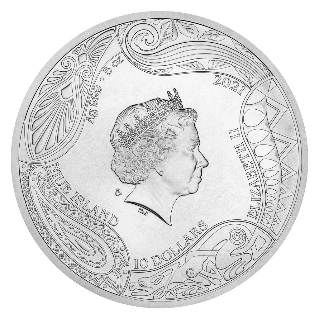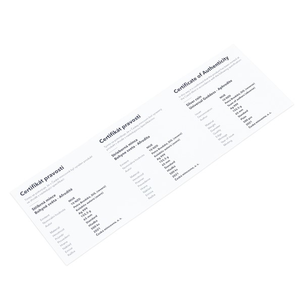 Reverzní strana mince, jejíž autorkou je medailérka Petra Brodská, DiS., předkládá křehkou bohyni s růží v ruce. Její krásu podtrhují nejrůznější ozdoby – čelenka, náušnice, náhrdelník, tradiční oděv chitón – a nechybí ani mušle hřebenatka. To vše obklopují charakteristické helénské ornamenty, které najdete také na averzní straně mince. Tam je doprovázejí motivy severského, slovanského, indického a egyptského původu – averz je totiž společný celému cyklu božských mincí. Protože mince České mincovny vycházejí v licenci zahraničního emitenta, kterým je ostrov Niue, nese averz ještě jeho náležitosti – nominální hodnotu 10 DOLLARS (NZD), jméno a portrét královny Alžběty II. a rok emise 2021.