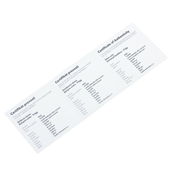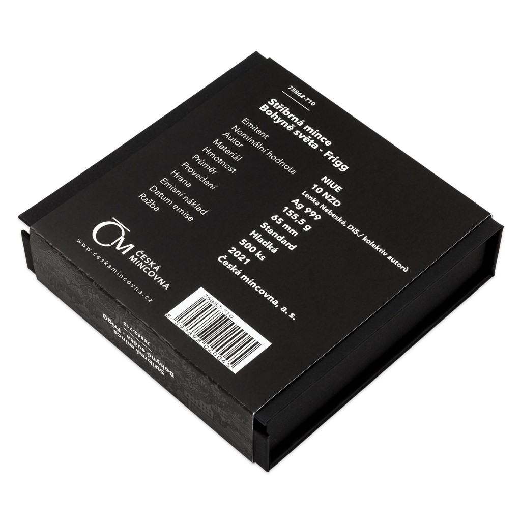 Reverzní strana mince, jejíž autorkou je medailérka Lenka Nebeská, DiS., předkládá vznešenou Frigg sedící na trůnu. V ruce drží vřeteno osudu, ze kterého malé dítě odmotává přízi. V pozadí stojí volavka – zvíře zasvěcené bohyni – a celý reliéf obklopují charakteristické vikingské ornamenty, které najdete také na averzní straně mince. Tam je doprovázejí motivy řeckého, slovanského, indického a egyptského původu – averz je totiž společný celému cyklu božských mincí. Protože mince České mincovny vycházejí v licenci zahraničního emitenta, kterým je ostrov Niue, nese averz ještě jeho náležitosti – nominální hodnotu 10 DOLLARS (NZD), jméno a portrét královny Alžběty II. a rok emise 2021.