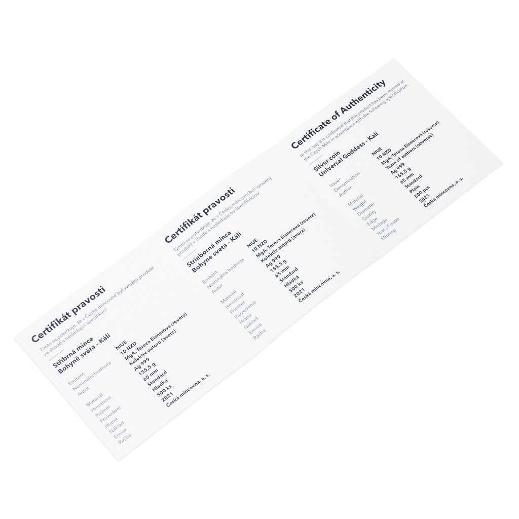 Reverzní strana mince, jejíž autorkou je medailérka MgA. Tereza Eisnerová, předkládá děsivou Kálí se čtyřma rukama a třema očima. Polopostavu bohyně obklopují charakteristické hinduistické ornamenty, které najdete také na averzní straně mince. Tam je doprovázejí motivy řeckého, severského, slovanského a egyptského původu – averz je totiž společný celému cyklu božských mincí. Protože mince České mincovny vycházejí v licenci zahraničního emitenta, kterým je ostrov Niue, nese averz ještě jeho náležitosti – nominální hodnotu 10 DOLLARS (NZD), jméno a portrét královny Alžběty II. a rok emise 2021.